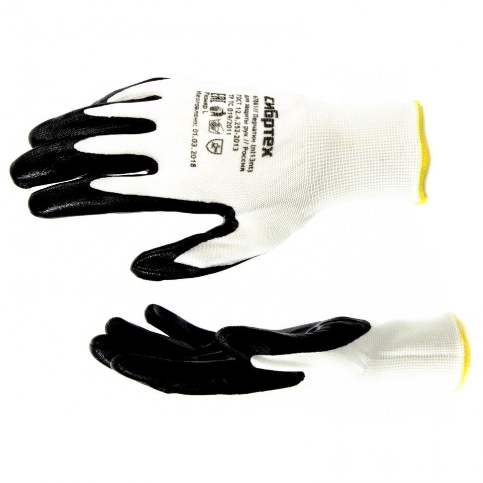 Маслобензостойкие полиэфирные перчатки Сибртех 67861 с черным нитрильным покрытием, 15 класса вязки, размера L, предназначены для выполнения хозяйственных, ремонтных, строительных и автослесарных работ, в том числе предполагающих контакт с агрессивными веществами. Покрытие из нитрила защищает кожу рук от попадания бензина, масла или краски, а также от влаги и загрязнений. Плотная пряжа предохраняет ладони от царапин, ссадин, порезов и мозолей. Перчатки будут полезны дома, в гараже или на даче.