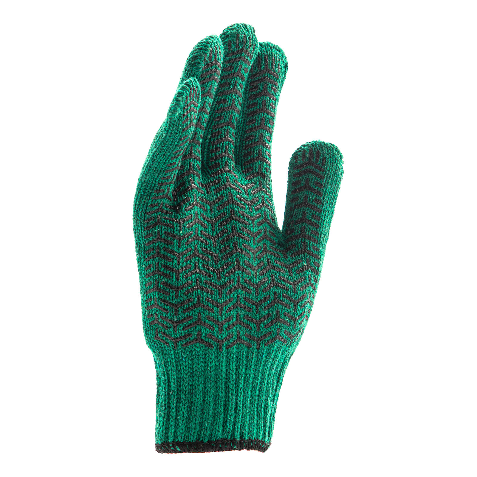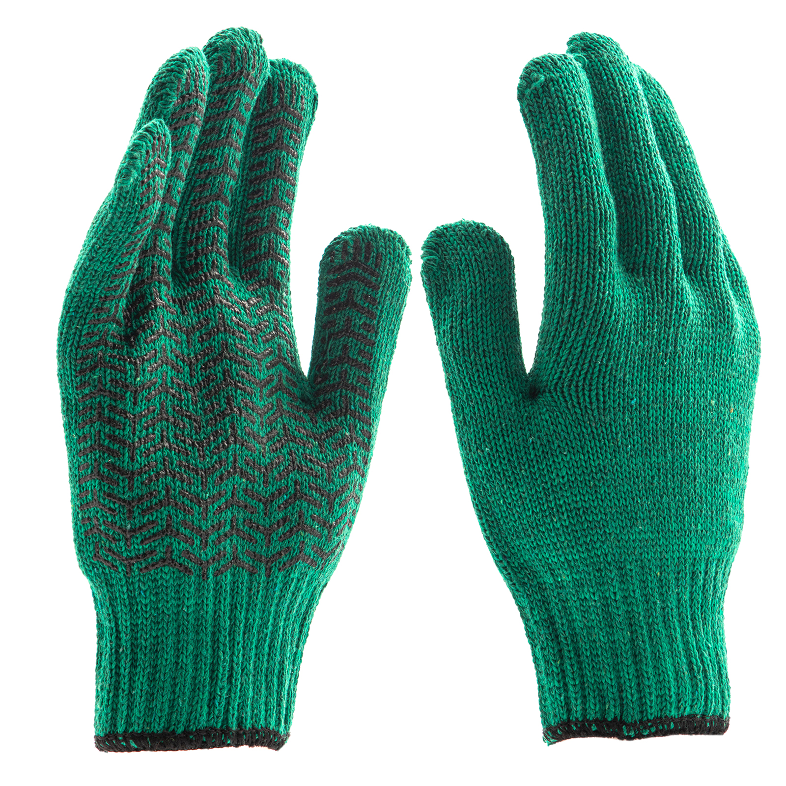Усиленные трикотажные перчатки Сибртех 68184, зеленые, с гелевым ПВХ-покрытием, 7 класса вязки, надевают на руки при выполнении тяжелых строительных, монтажных, ремонтных, сборочных и погрузо-разгрузочных работ. Толстая эластичная пряжа надежно защищает кисти рук от травм и попадания грязи, не препятствуя движениям пальцев. Нанесенный на ладонную сторону ПВХ-гель исключает скольжение и способствует надежному захвату инструментов и других предметов.