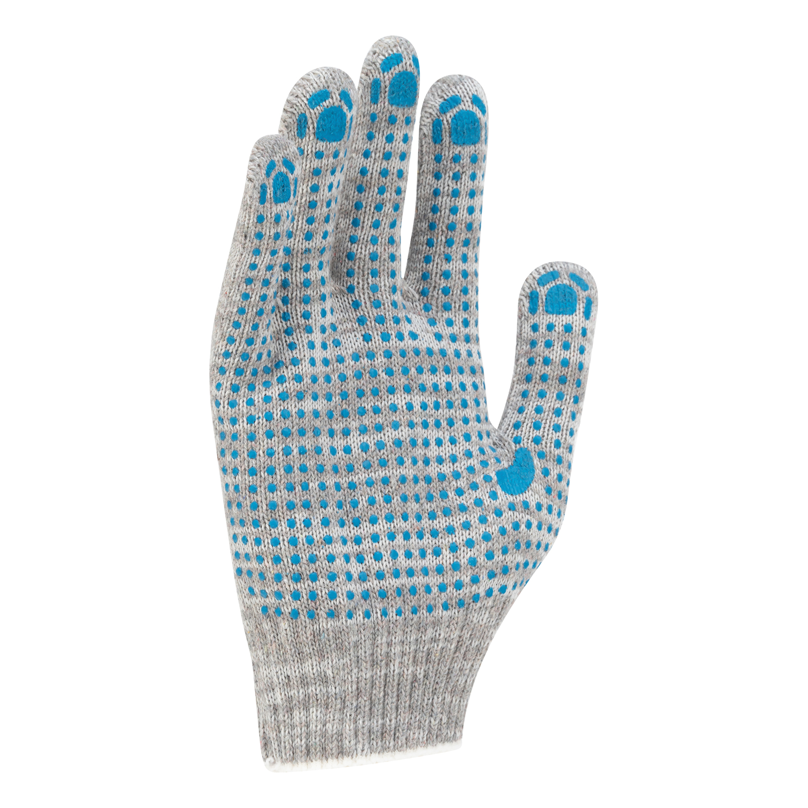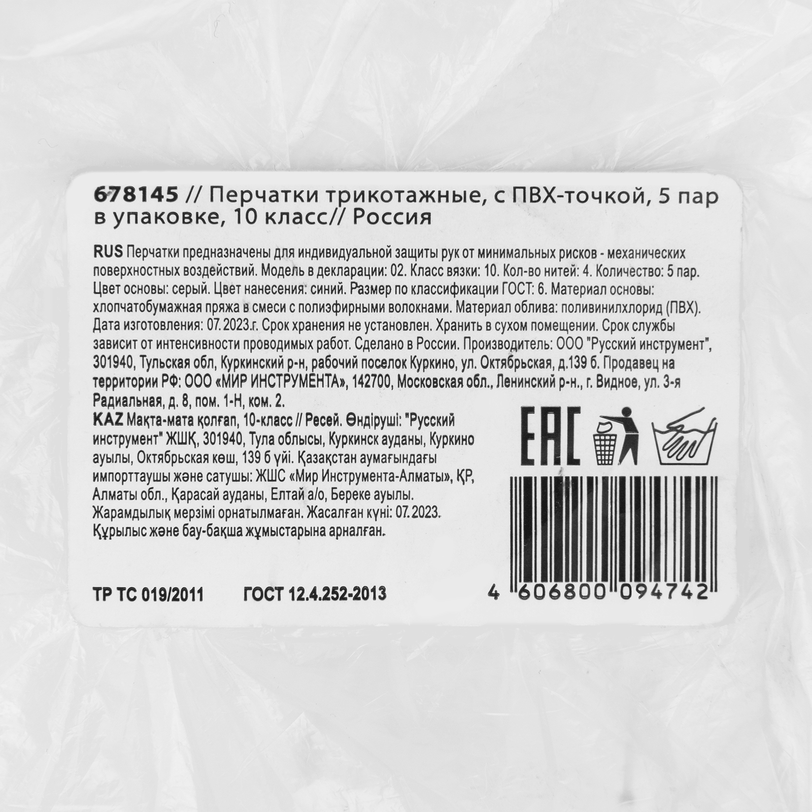 Перчатки трикотажные 678145 с ПВХ-точкой, 5 пар в упаковке, 10 класса вязки, защищают руки пользователя от царапин, порезов, ссадин, мозолей и загрязнений. Тонкая пряжа обеспечивает пальцам чувствительность, что позволяет выполнять точные работы. Благодаря ПВХ-покрытию ладонной части инструменты не выскальзывают из рук. Перчатки используют в строительстве, на производстве, во время ремонта помещений и обслуживания автомобилей. Пригодятся они и в хозяйстве.