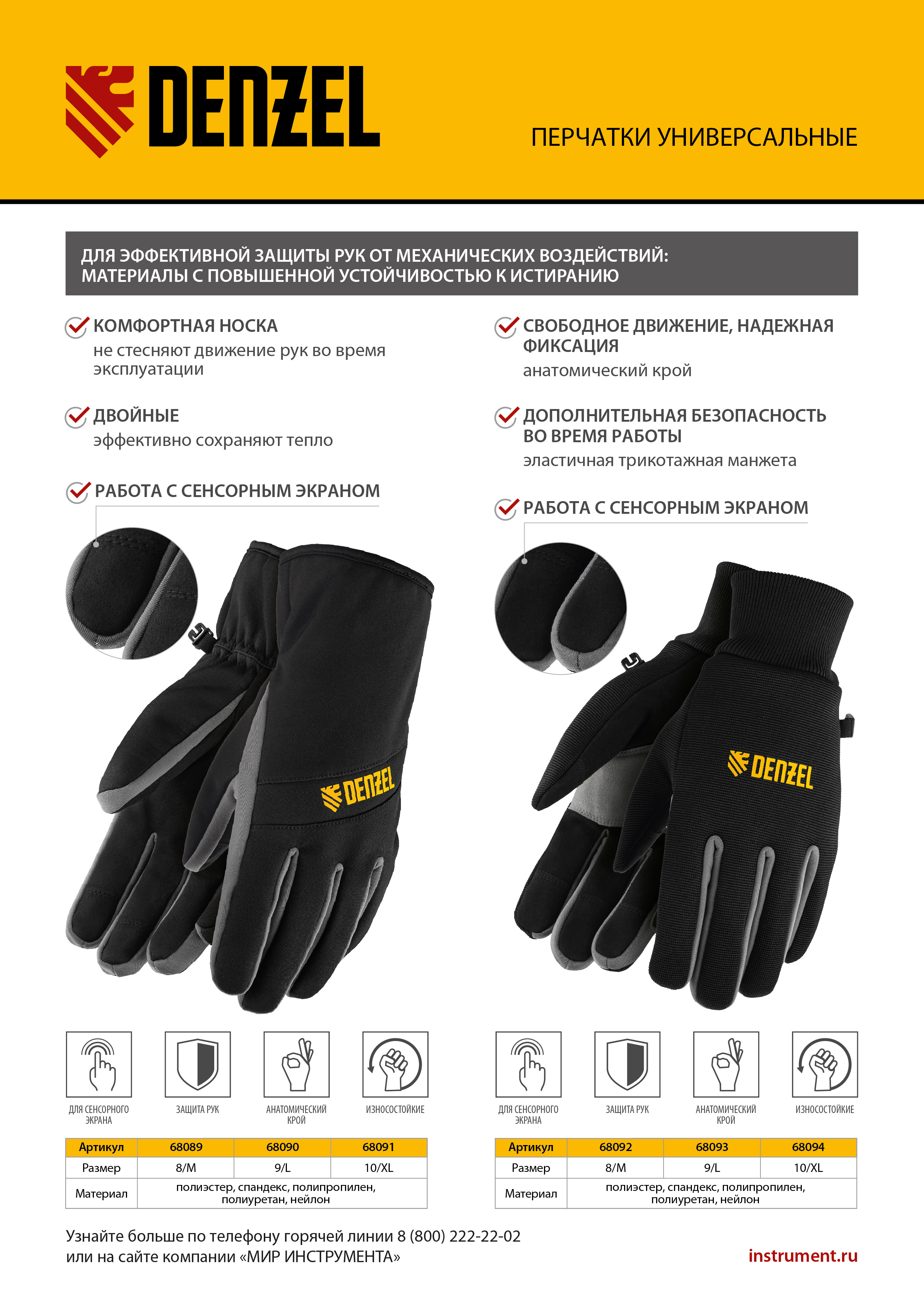 Универсальные двойные перчатки Denzel 68093 размера 9, с вязаной манжетой, защищают руки от механических воздействий и общепроизводственных загрязнений. Подходят для работы с сенсорным экраном — благодаря специальным накладкам на указательном и среднем пальцах можно не снимать перчатки, чтобы воспользоваться смартфоном. Перчатки пригодятся во время проведения строительных и ремонтных работ.