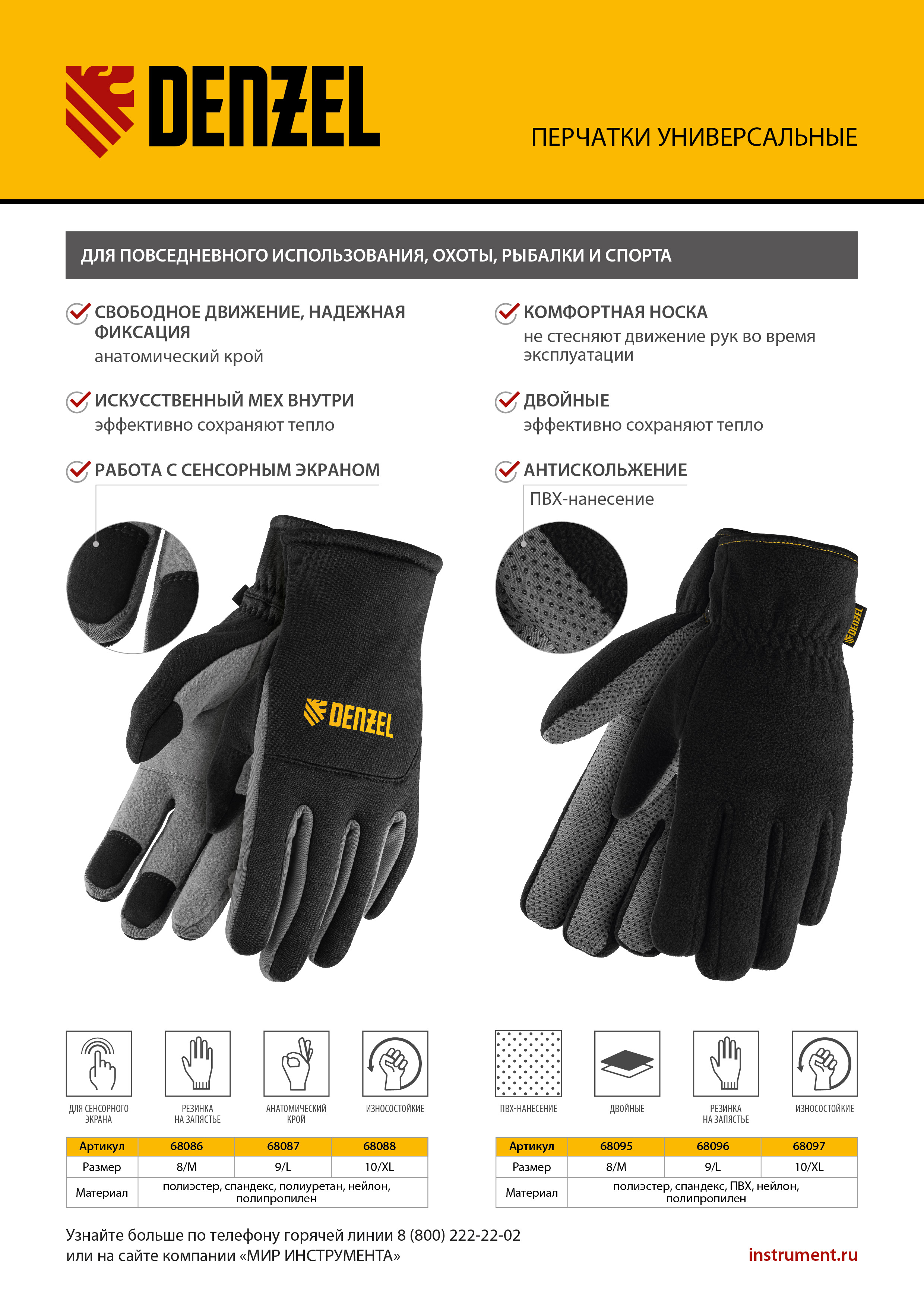 Универсальные перчатки Denzel 68087 размера 9, c искусственным мехом, предназначены для повседневного использования, а также будут полезны на охоте, рыбалке, во время занятий спортом. Подходят для работы с сенсорным экраном: специальные накладки на указательном и среднем пальцах позволяют пользоваться смартфоном, не снимая перчаток.