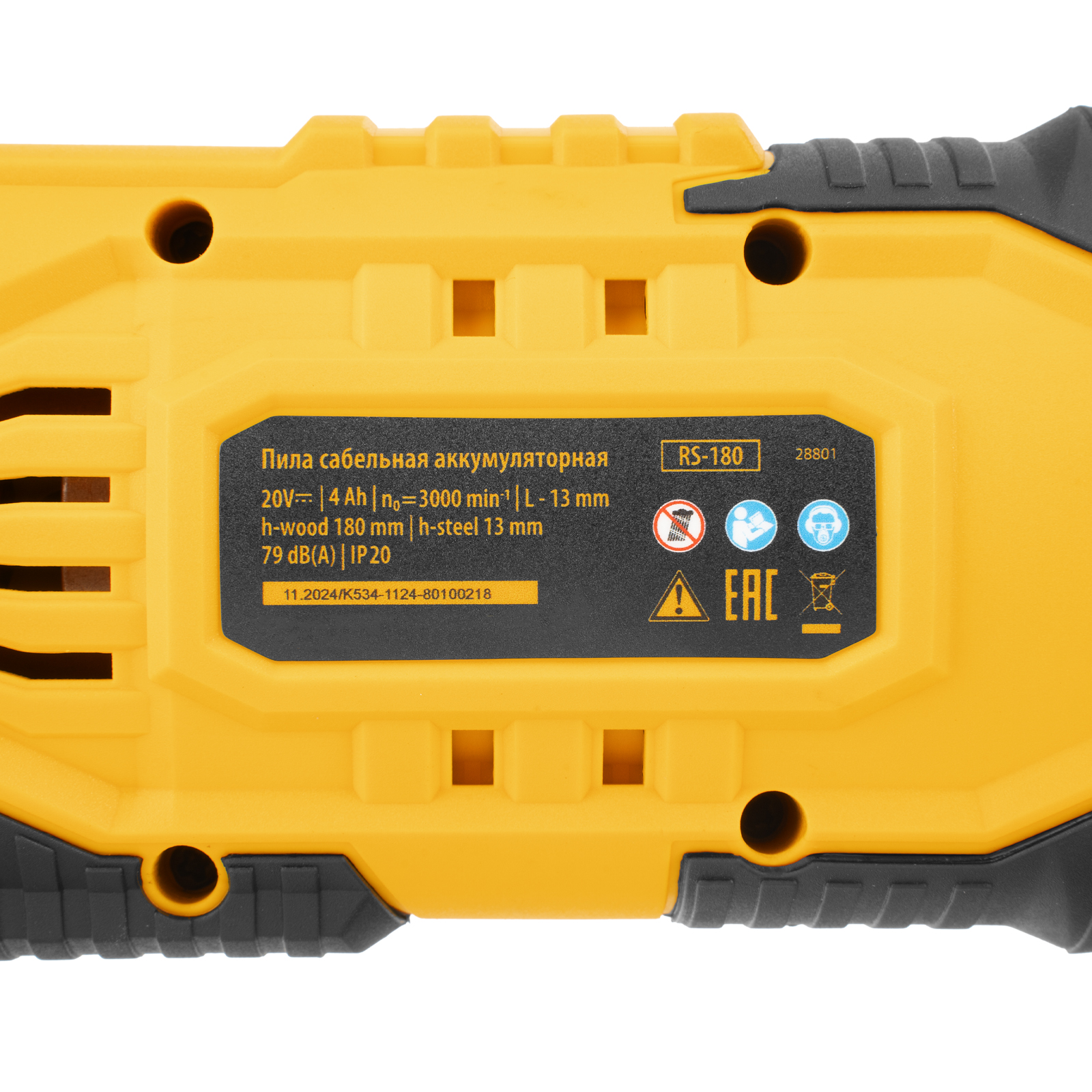 Пила сабельная аккумуляторная RS-180, Li-Ion, 20 В Denzel