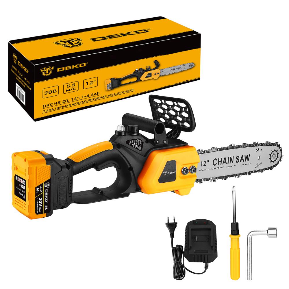 Пила цепная аккумуляторная бесщеточная DEKO DKCHS 20, 12", 20В, 1x4.2Ач, з/у 083-2021 |