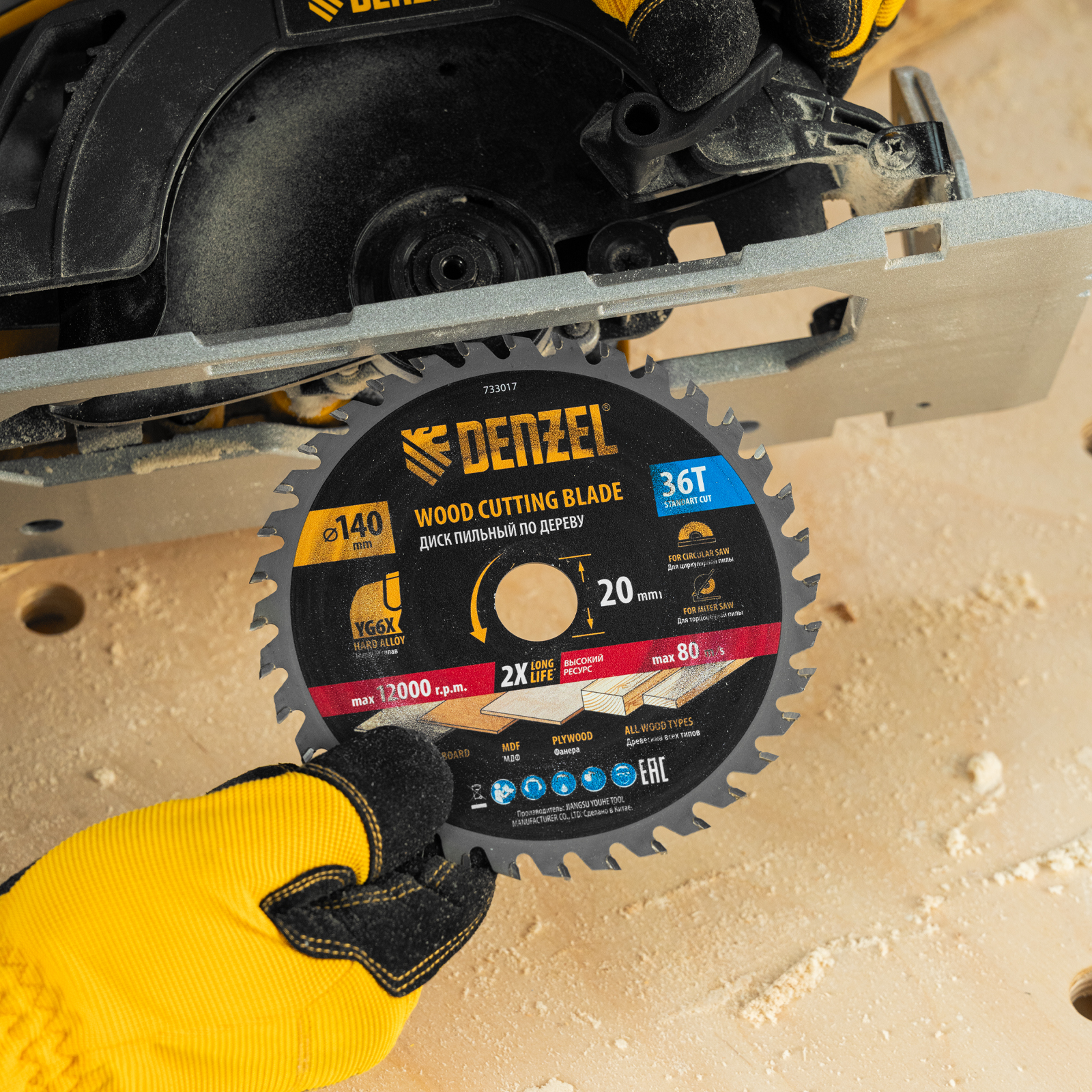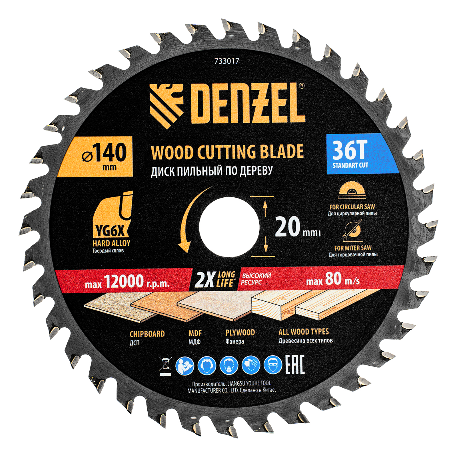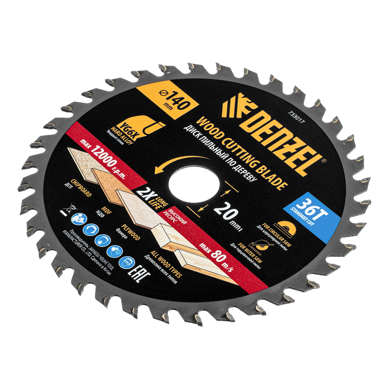 Пильный диск Denzel 733017 диаметром 140 x 20 мм, с 36 зубьями, предназначен для продольного и поперечного распила твердой и мягкой древесины, фанеры, МДФ, ДСП. 36 зубьев типа ATB с режущими пластинами оптимальной геометрии обеспечивают качественный рез. Тип реза — стандартный. Режущие пластины из твердого сплава YG6X сохраняют рабочие свойства при интенсивном использовании. Диск устанавливается на циркулярную, торцовочную пилу или на распиловочный станок. В комплект поставки входит переходное кольцо с 20 на 16 мм, что позволяет изменить посадочный размер и расширяет возможности использования диска.