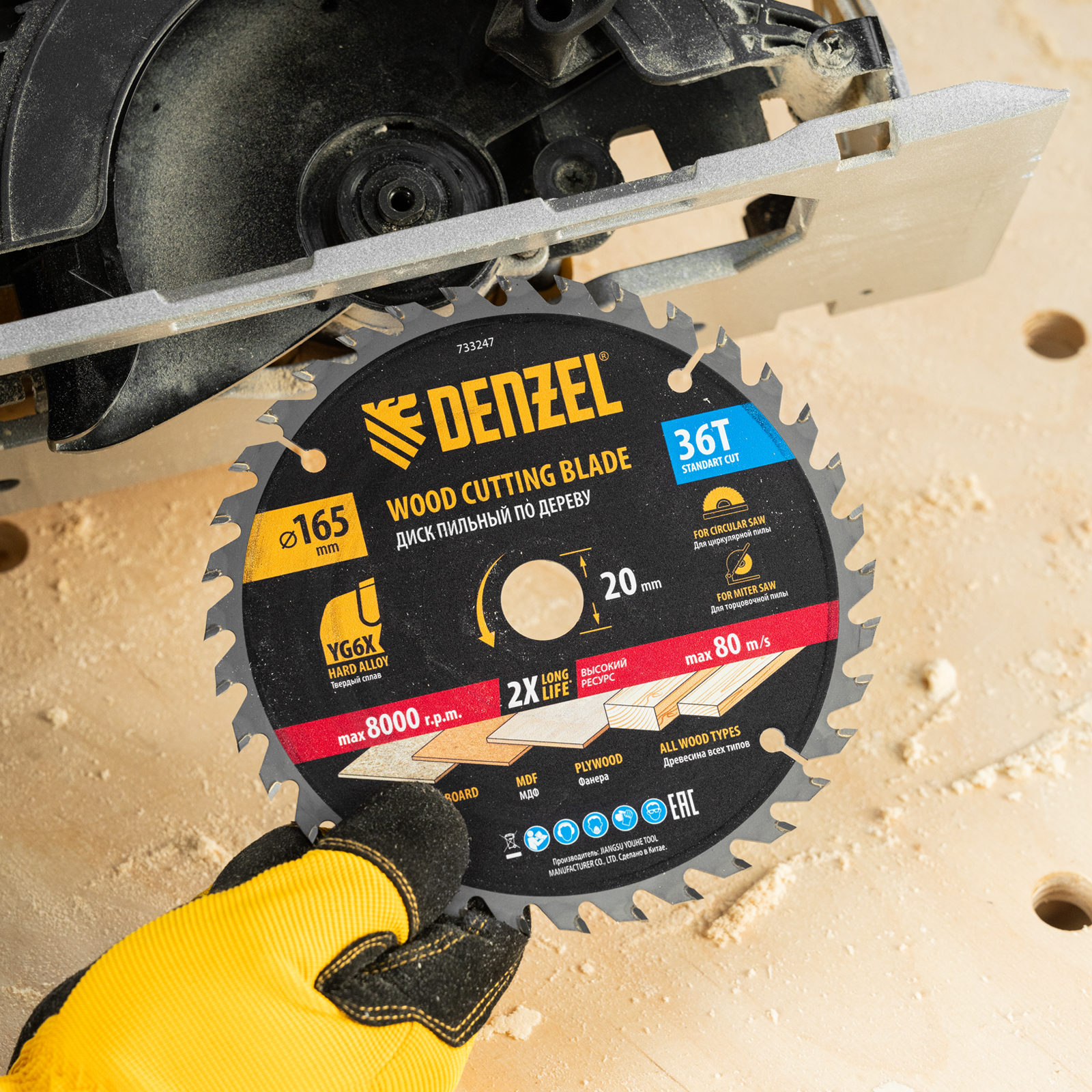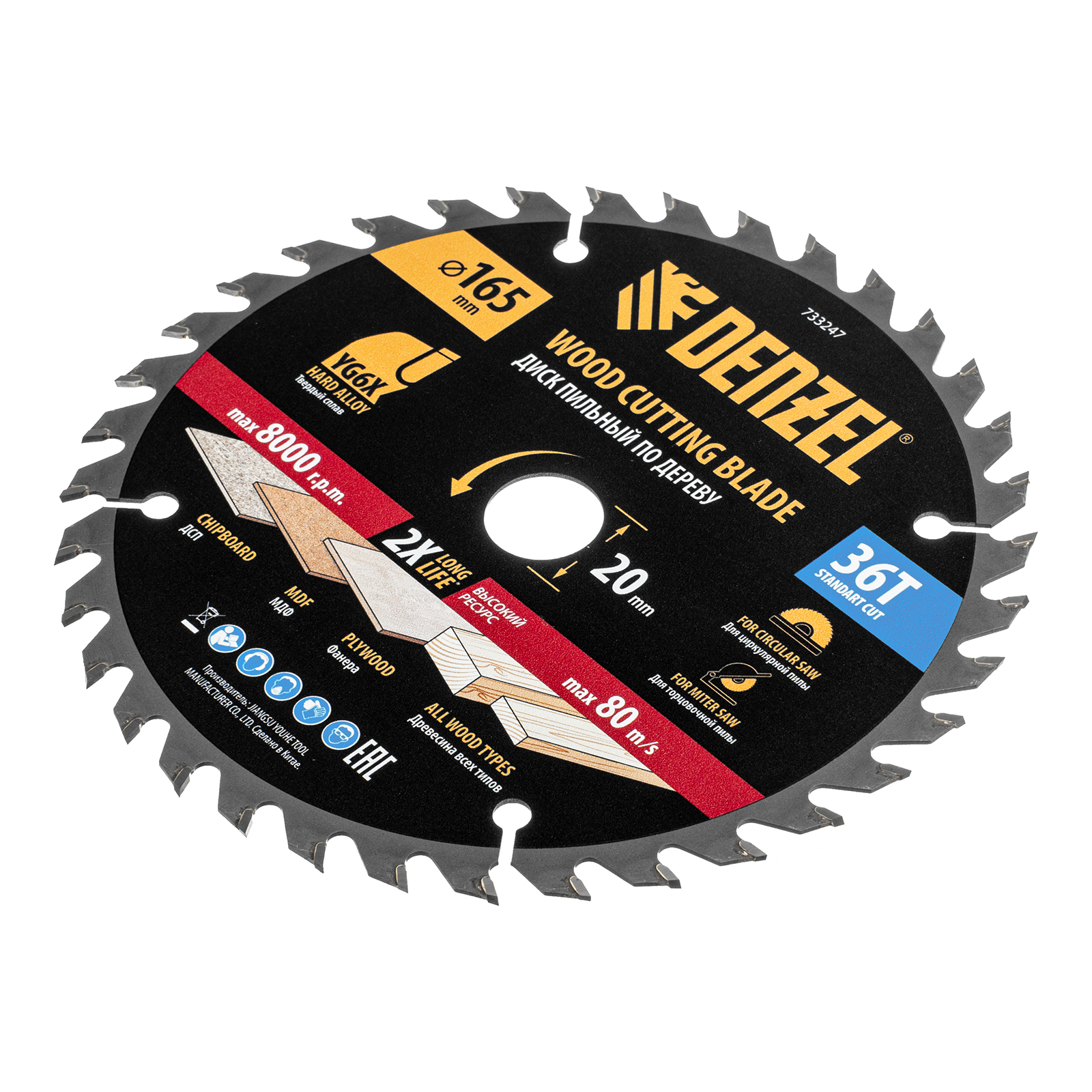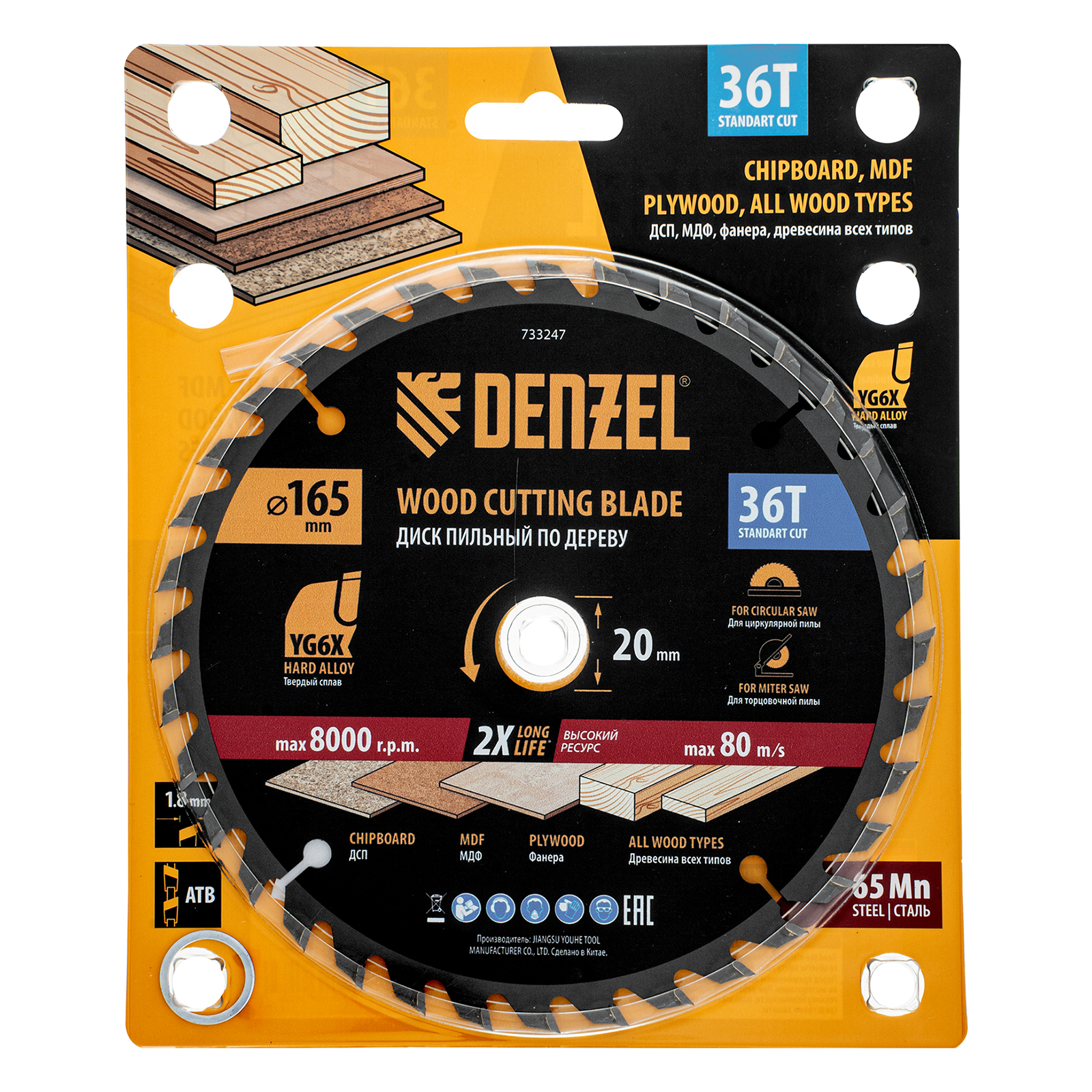 Пильный диск Denzel 733247 диаметром 165 x 20 мм, с 36 зубьями, предназначен для продольного и поперечного распила твердой и мягкой древесины, фанеры, МДФ, ДСП. 36 зубьев типа ATB с режущими пластинами оптимальной геометрии обеспечивают качественный рез. Тип реза — стандартный. Режущие пластины из твердого сплава YG6X сохраняют рабочие свойства при интенсивном использовании. Диск устанавливается на циркулярную, торцовочную пилу или на распиловочный станок. В комплект поставки входит переходное кольцо с 20 на 16 мм, что позволяет изменить посадочный размер и расширяет возможности использования диска.