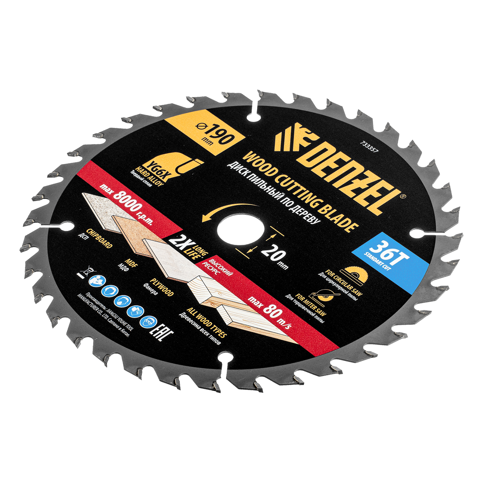 Пильный диск Denzel 733357 диаметром 190 x 20 мм, с 36 зубьями, предназначен для продольного и поперечного распила твердой и мягкой древесины, фанеры, МДФ, ДСП. 36 зубьев типа ATB с режущими пластинами оптимальной геометрии обеспечивают качественный рез. Тип реза — стандартный. Режущие пластины из твердого сплава YG6X сохраняют рабочие свойства при интенсивном использовании. Диск устанавливается на циркулярную, торцовочную пилу или на распиловочный станок. В комплект поставки входит переходное кольцо с 20 на 16 мм, что позволяет изменить посадочный размер и расширяет возможности использования диска.