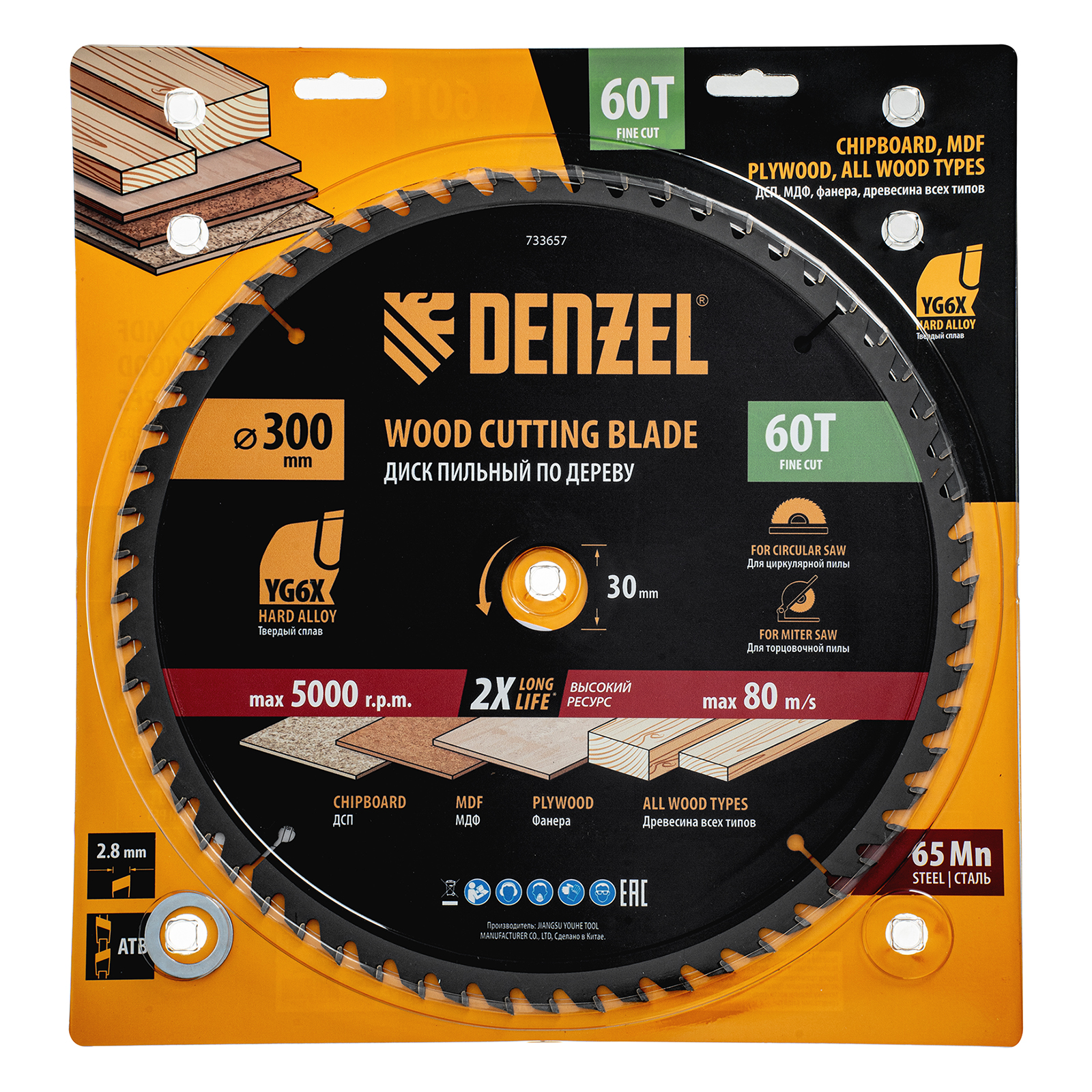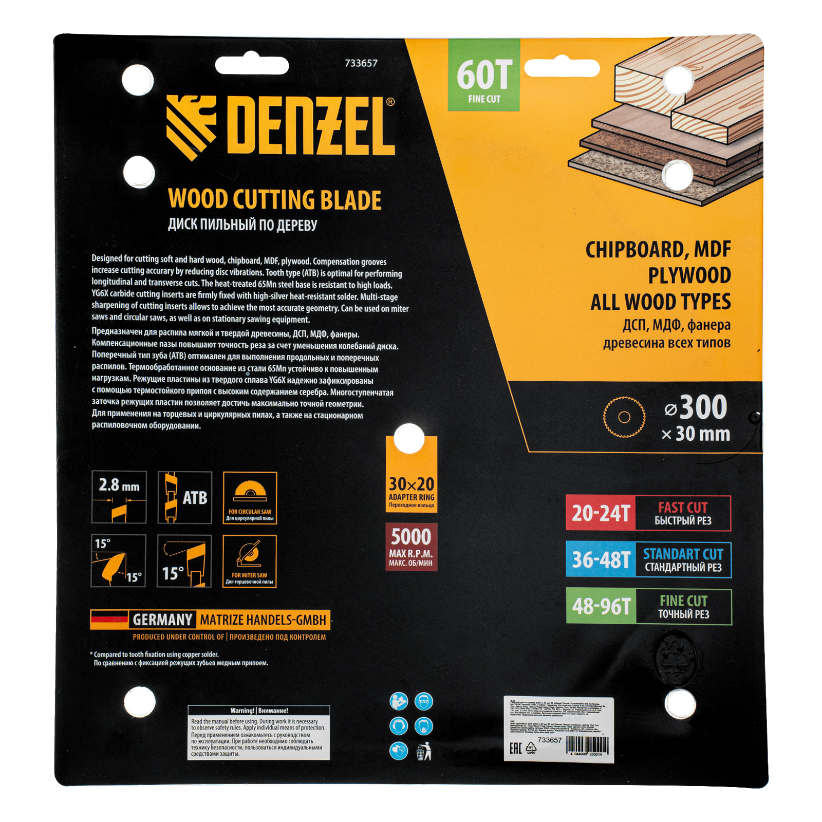 Пильный диск Denzel 733657 диаметром 300 x 30 мм, с 60 зубьями, предназначен для точного продольного и поперечного распила твердой и мягкой древесины, фанеры, МДФ, ДСП. 60 зубьев типа ATB с режущими пластинами оптимальной геометрии обеспечивают чистый рез. Режущие пластины из твердого сплава YG6X сохраняют рабочие свойства при интенсивном использовании. Диск устанавливается на циркулярную, торцовочную пилу или на распиловочный станок. В комплект поставки входит переходное кольцо с 30 на 20 мм, что позволяет изменить посадочный размер и расширяет возможности использования диска.