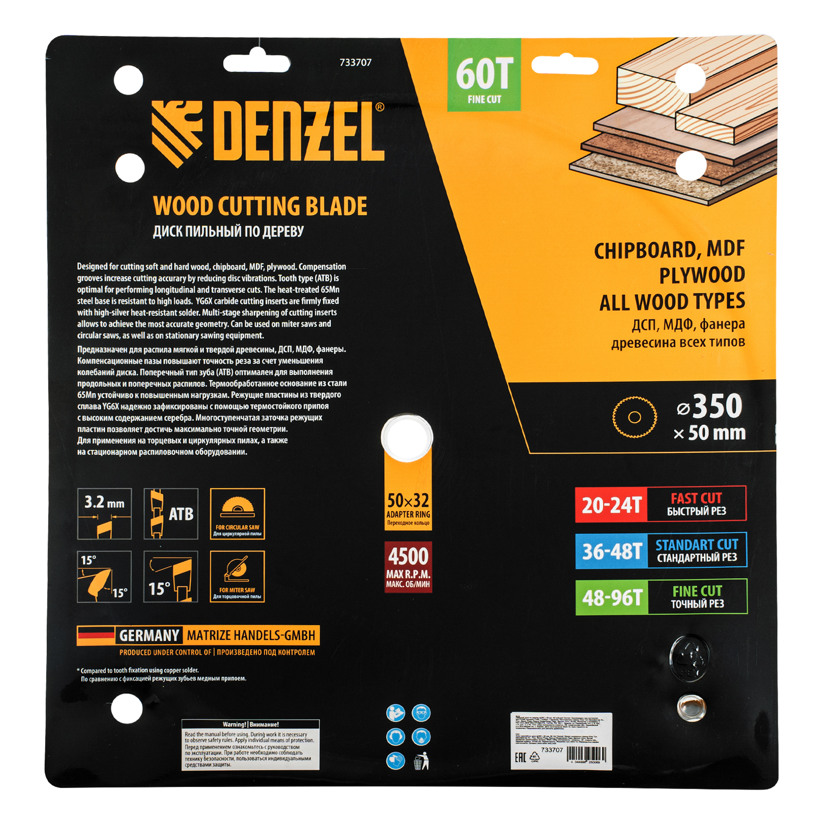 Пильный диск Denzel 733707 диаметром 350 x 50 мм, с 60 зубьями, предназначен для точного продольного и поперечного распила твердой и мягкой древесины, фанеры, МДФ, ДСП. 60 зубьев типа ATB с режущими пластинами оптимальной геометрии обеспечивают чистый рез. Режущие пластины из твердого сплава YG6X сохраняют рабочие свойства при интенсивном использовании. Диск устанавливается на циркулярную, торцовочную пилу или на распиловочный станок. В комплект поставки входит переходное кольцо с 50 на 32 мм, что позволяет изменить посадочный размер и расширяет возможности использования диска.
