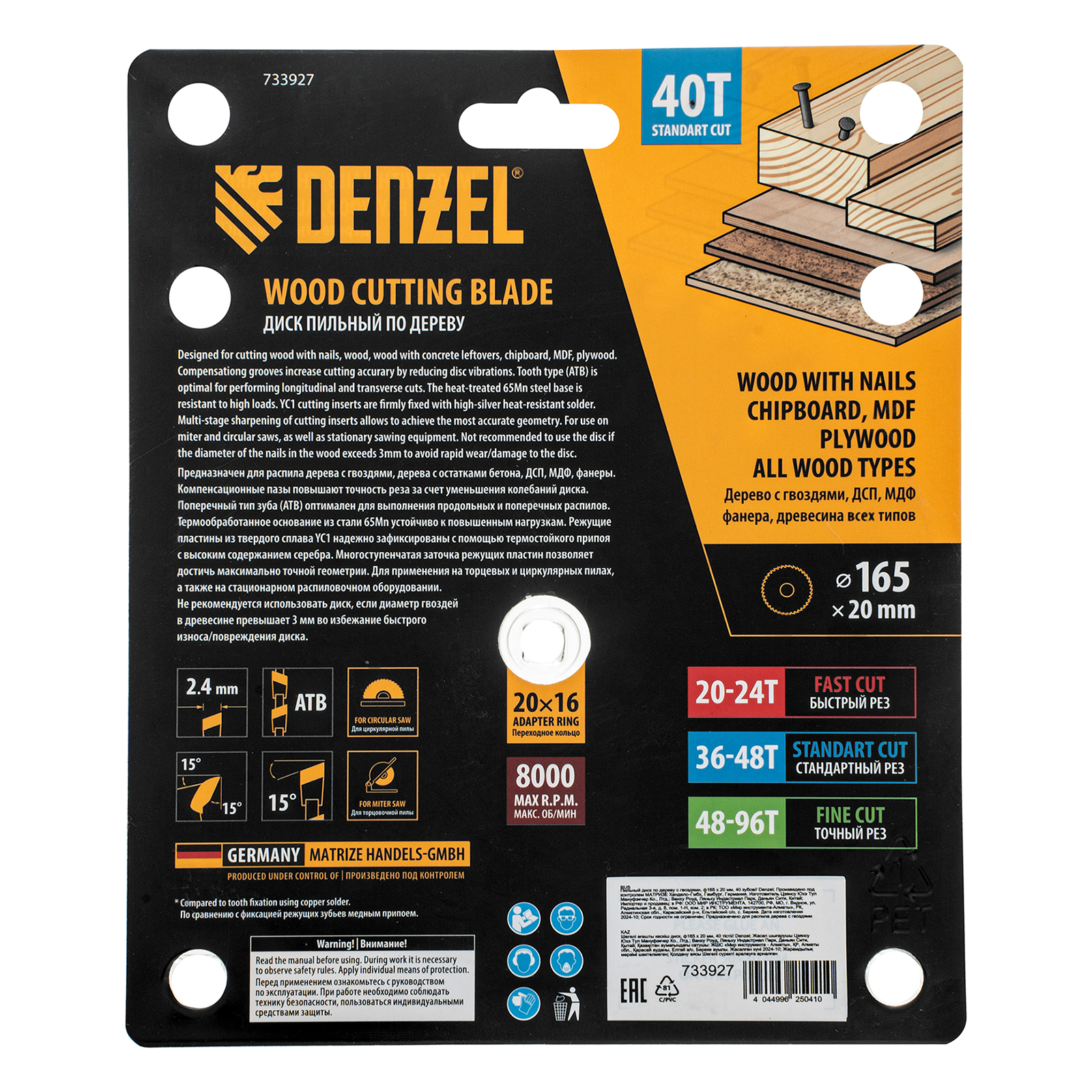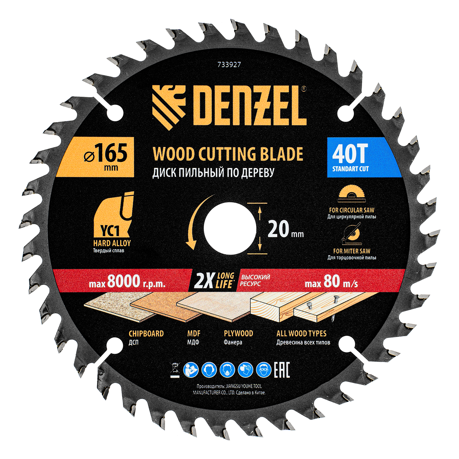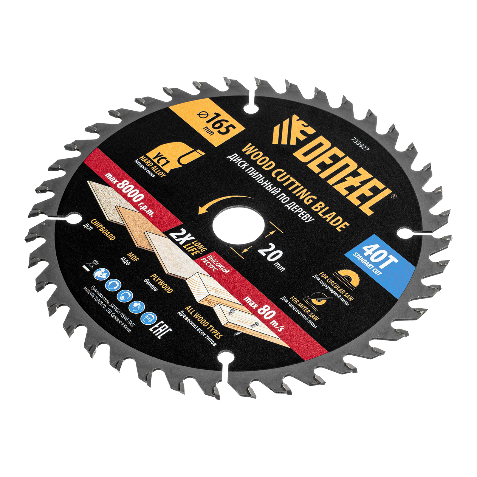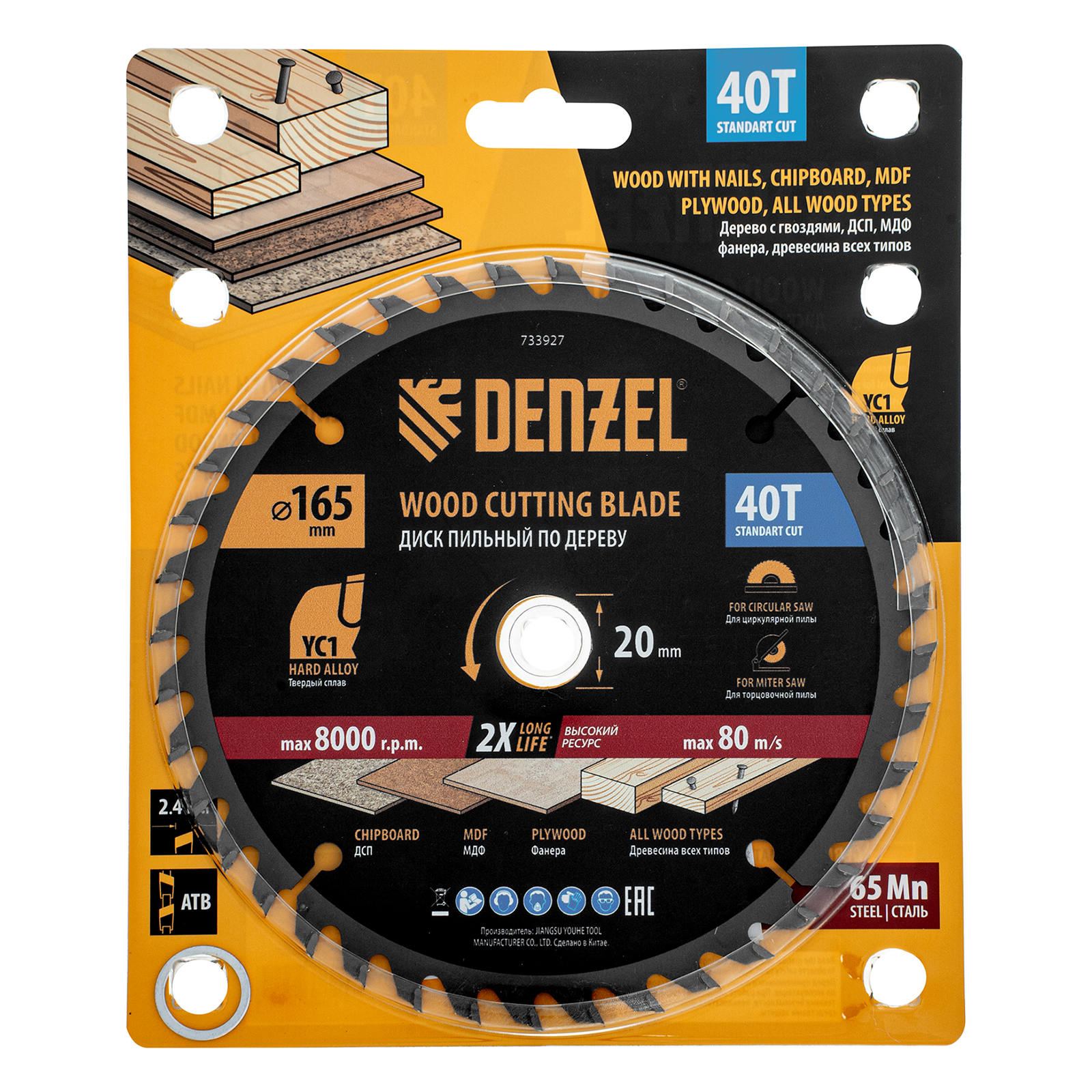 Пильный диск Denzel 733927 диаметром 165 x 20 мм, с 40 зубьями типа ATB, предназначен для продольного и поперечного распиливания древесины всех типов, в том числе с гвоздями и остатками бетона, а также ДСП, МДФ, фанеры. Режущие пластины из твердого сплава YC1, прошедшие многоступенчатую заточку, позволяют успешно справляться с прочными материалами. Диск устанавливается на циркулярную, торцовочную пилу или на распиловочный станок. В комплект поставки входит переходное кольцо 20/16 мм, позволяющее изменить посадочный диаметр при необходимости.
