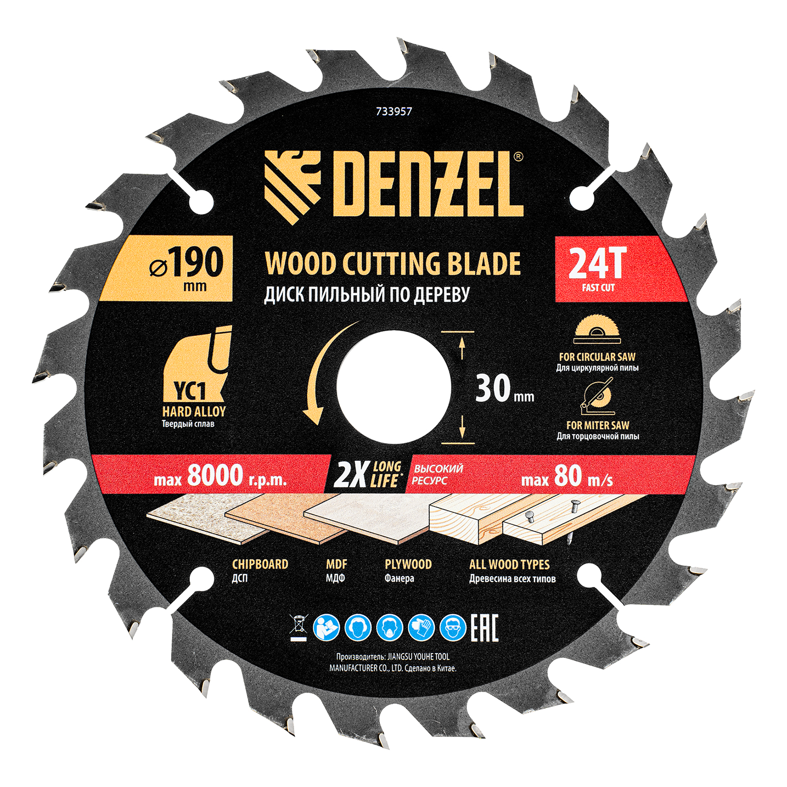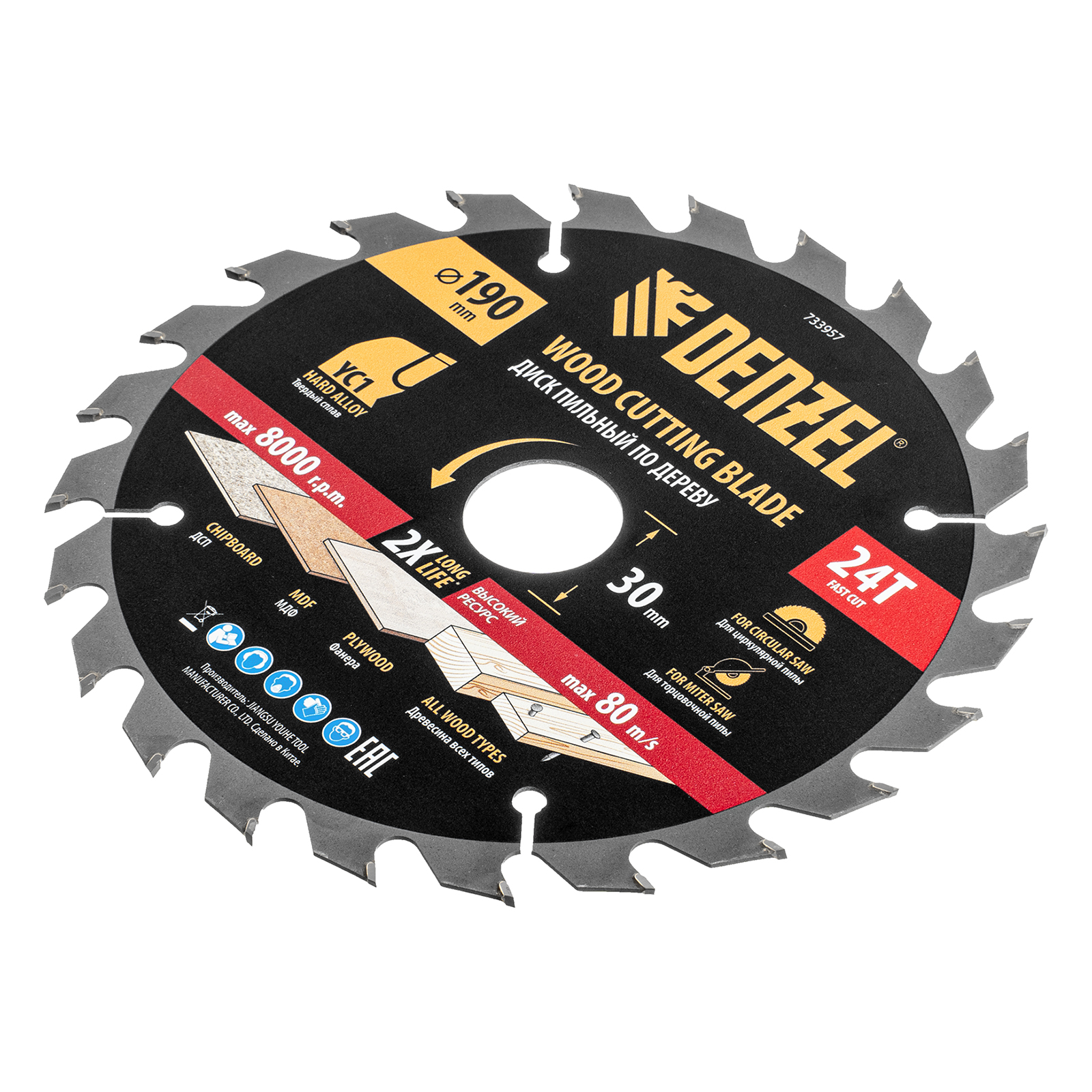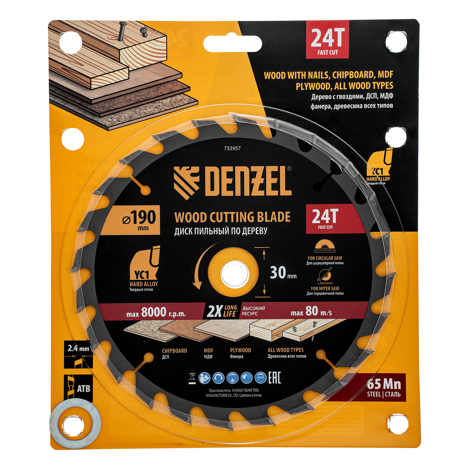 Пильный диск Denzel 733957 диаметром 190 x 30 мм, с 24 зубьями типа ATB, предназначен для быстрого продольного и поперечного распиливания древесины всех типов, в том числе с гвоздями и остатками бетона, а также ДСП, МДФ, фанеры. Режущие пластины из твердого сплава YC1, прошедшие многоступенчатую заточку, позволяют успешно справляться с прочными материалами. Диск устанавливается на циркулярную, торцовочную пилу или на распиловочный станок. В комплект поставки входит переходное кольцо 30/20 мм, позволяющее изменить посадочный диаметр при необходимости.