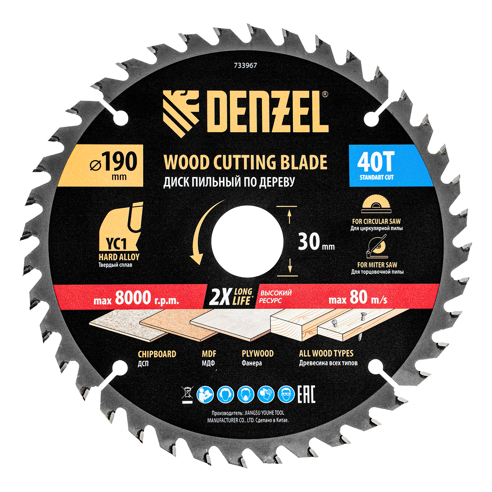 Пильный диск Denzel 733967 диаметром 190 x 30 мм, с 40 зубьями типа ATB, предназначен для продольного и поперечного распиливания древесины всех типов, в том числе с гвоздями и остатками бетона, а также ДСП, МДФ, фанеры. Тип реза — стандартный. Режущие пластины из твердого сплава YC1, прошедшие многоступенчатую заточку, позволяют успешно справляться с прочными материалами. Диск устанавливается на циркулярную, торцовочную пилу или на распиловочный станок. В комплект поставки входит переходное кольцо 30/20 мм, позволяющее изменить посадочный диаметр при необходимости.