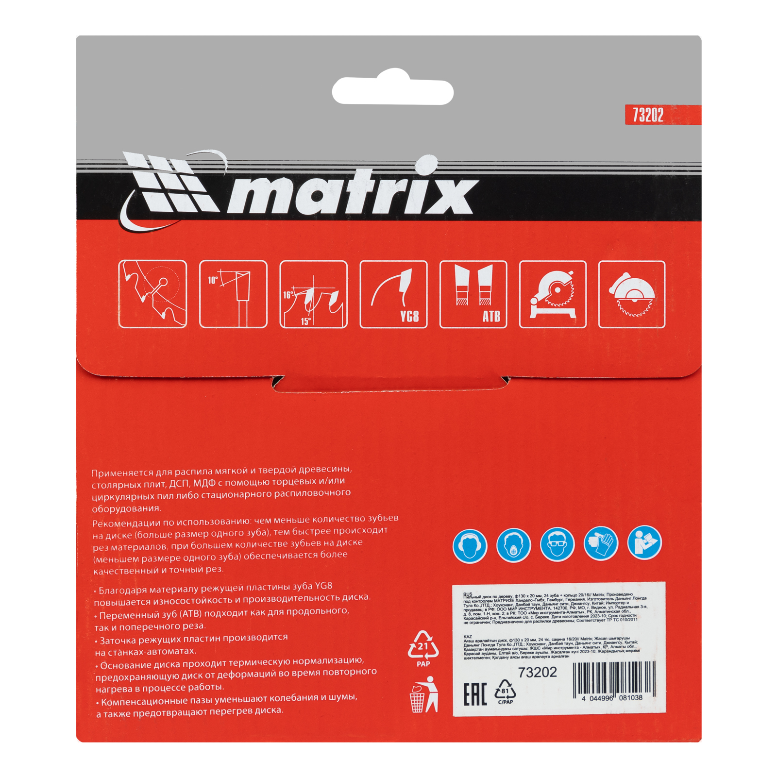 Пильный диск по дереву Matrix 73202 диаметром 130 х 20 мм, с 24 зубьями и переходным кольцом 20/16, — оснастка для циркулярных и торцовочных пил с соответствующим посадочным и внешним диаметром. Используется для продольного/поперечного реза материалов из мягкой и твердой древесины, ДСП, ДВП, фанеры, столярных плит. В комплект поставки входит переходное кольцо 20/16, позволяющее самостоятельно изменить посадочный диаметр при необходимости. Диск подходит для бытового и профессионального применения.