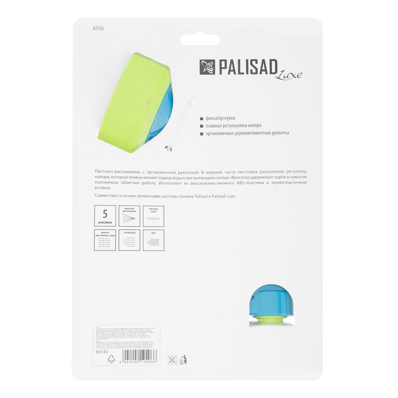 Пистолет-распылитель Palisad Luxe 65142 с 5 режимами и плавным регулятором напора устанавливается в качестве насадки на шланг и совместим с любыми системами полива ТМ Palisad. Благодаря ему можно быстро полить огород, сад, газон, очистить дорожки и рабочий инвентарь. Простая, но надежная конструкция пистолета позволяет использовать его для решения бытовых и профессиональных задач.
