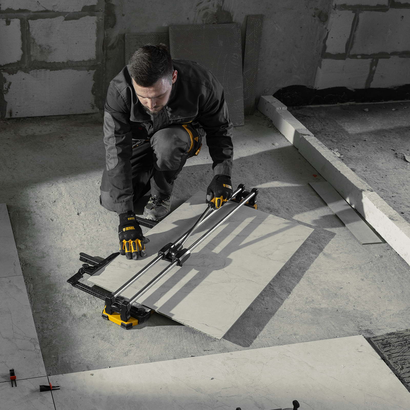 - Удобная работа — благодаря противоскользящим накладкам плиткорез не смещается даже на гладких поверхностях.