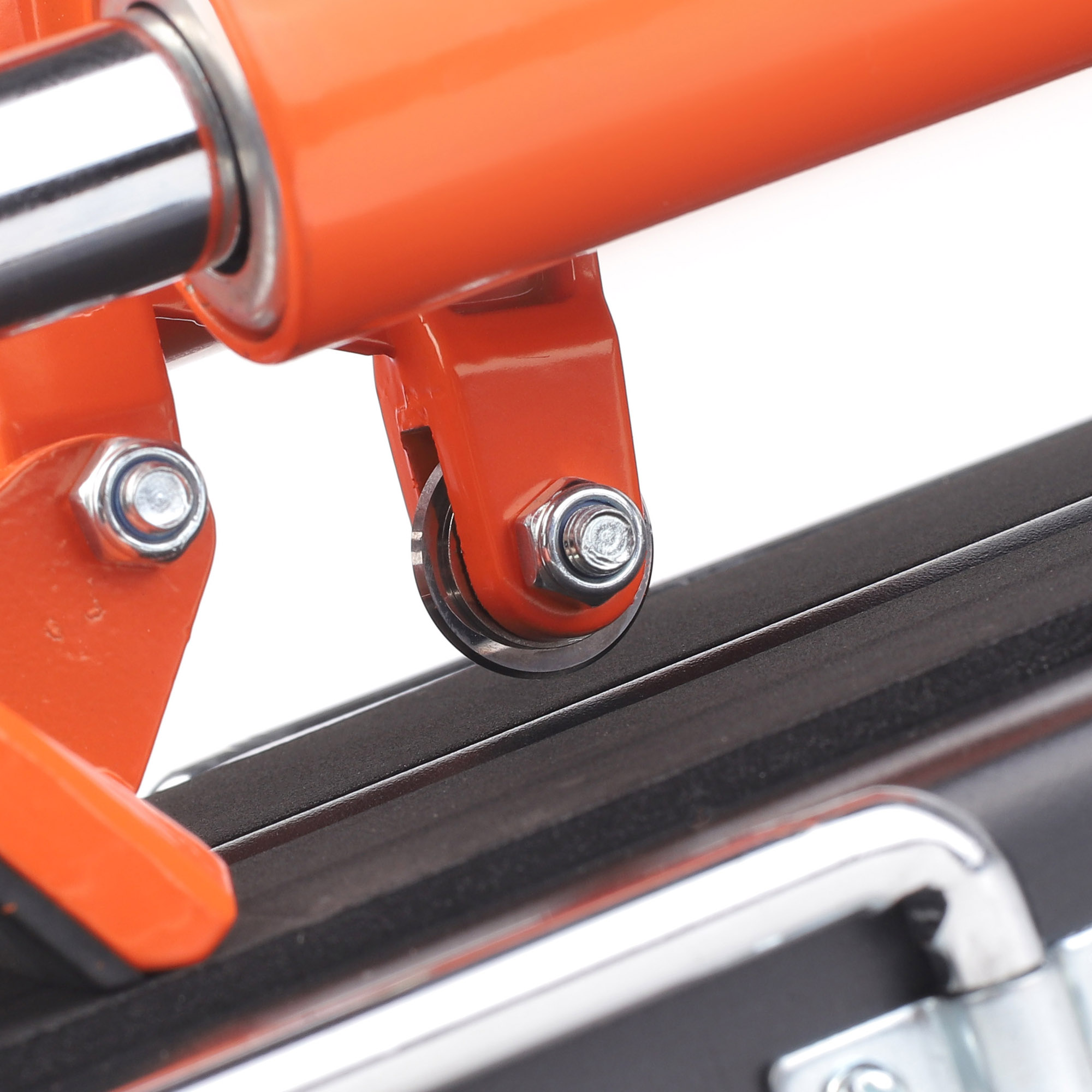 Модель имеет линейку-угольник для резки плитки под углом 30-45-60°, регулировки размера, дополнительной фиксации отрезаемой заготовки и точного положения плитки.
