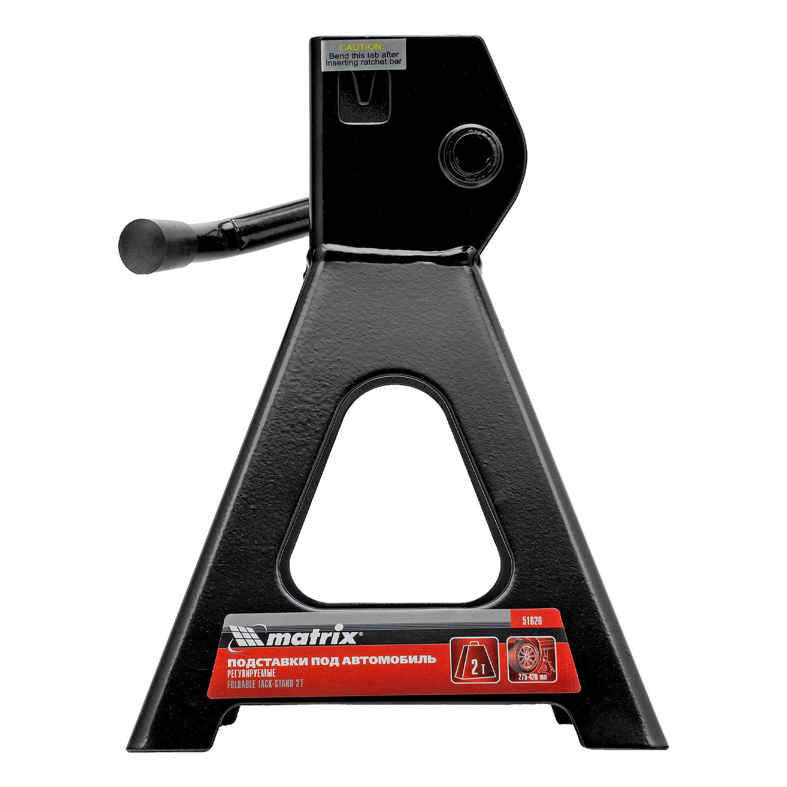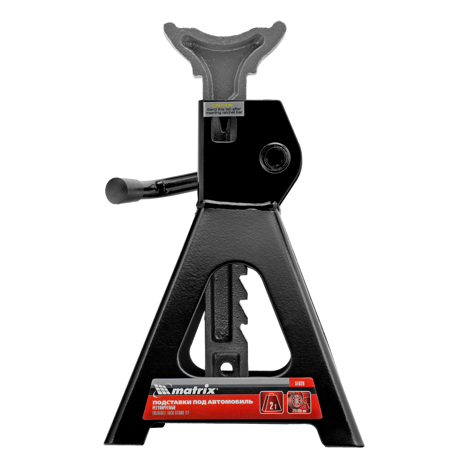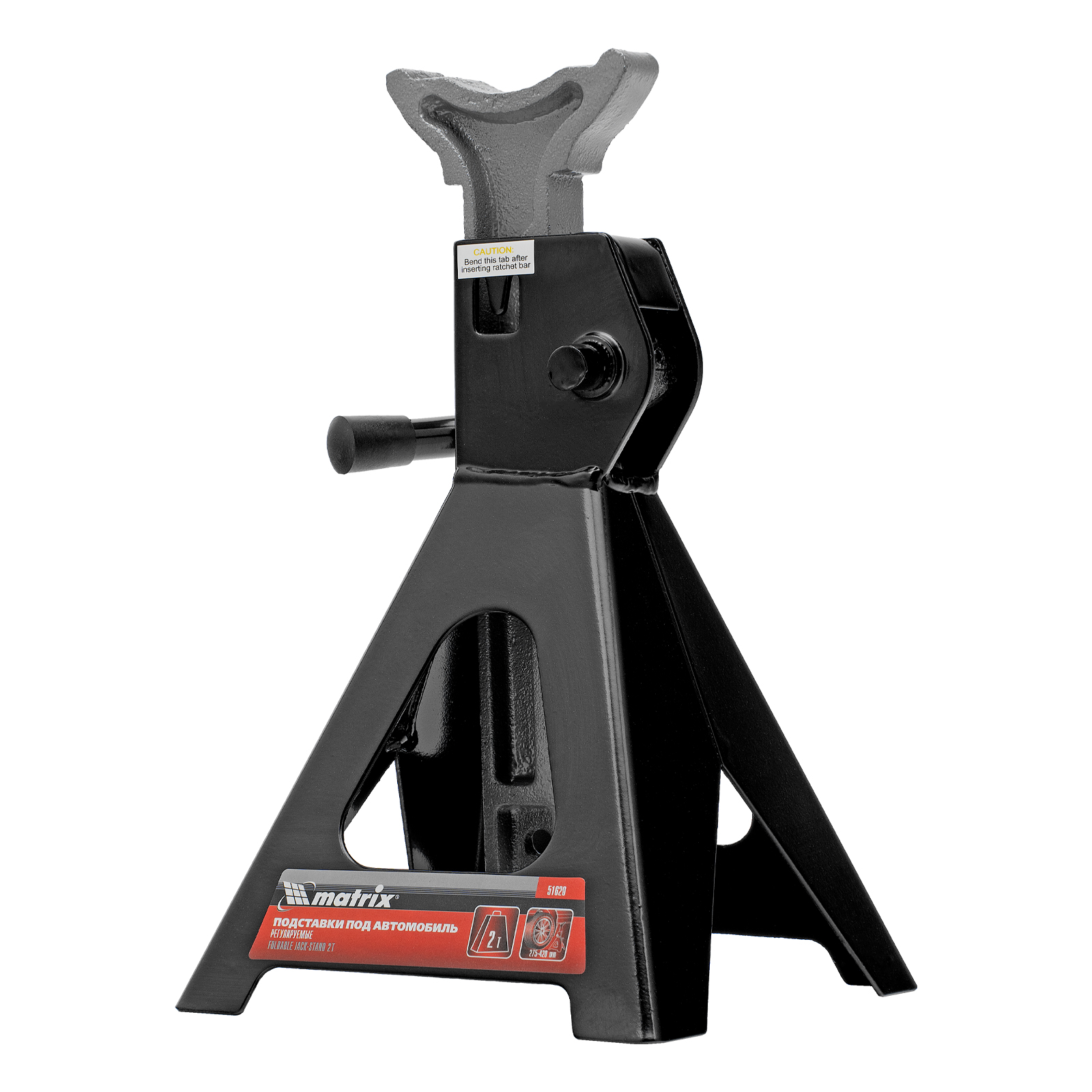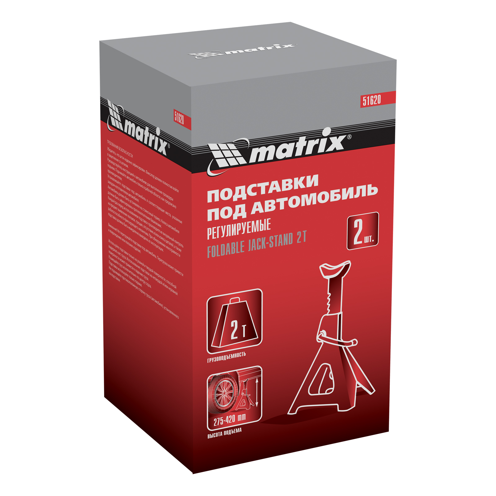 Регулируемые подставки под автомобиль Matrix 51620 с несущей способностью 2 т, 2 шт. в комплекте, удерживают груз на высоте 275-420 мм. Их используют в качестве средства дополнительной фиксации и страховки легкового автомобиля, поднятого на подъемнике или домкрате. Конструкцией предусмотрен зубчатый механизм, надежно удерживающий шток в выдвинутом положении. Подставки пригодятся в гараже или автосервисе во время проведения ремонтных работ.