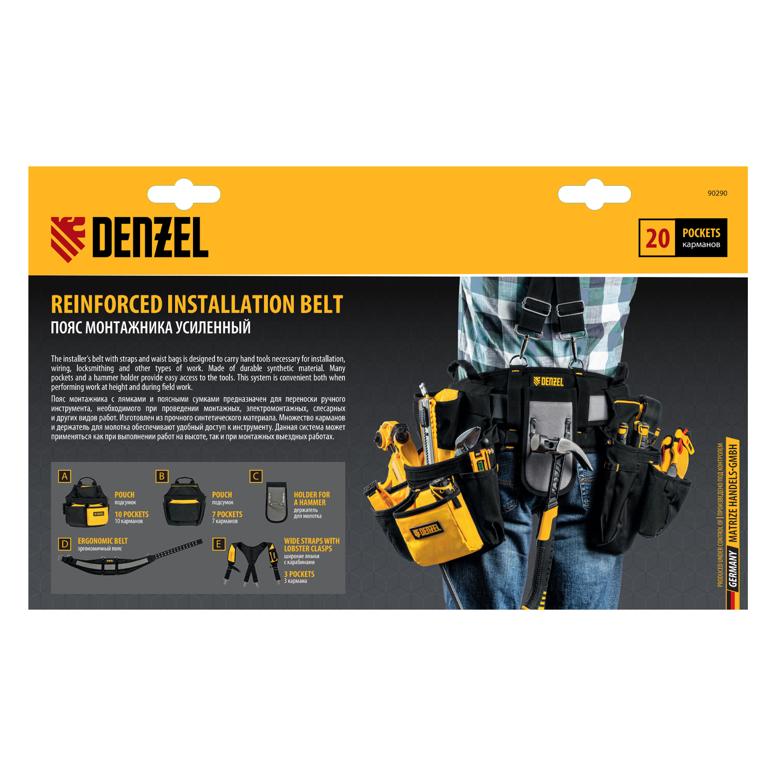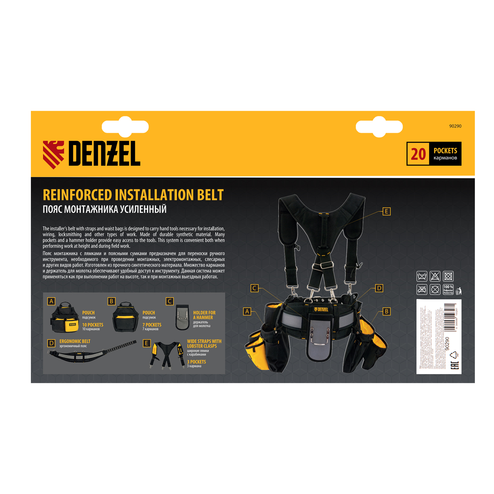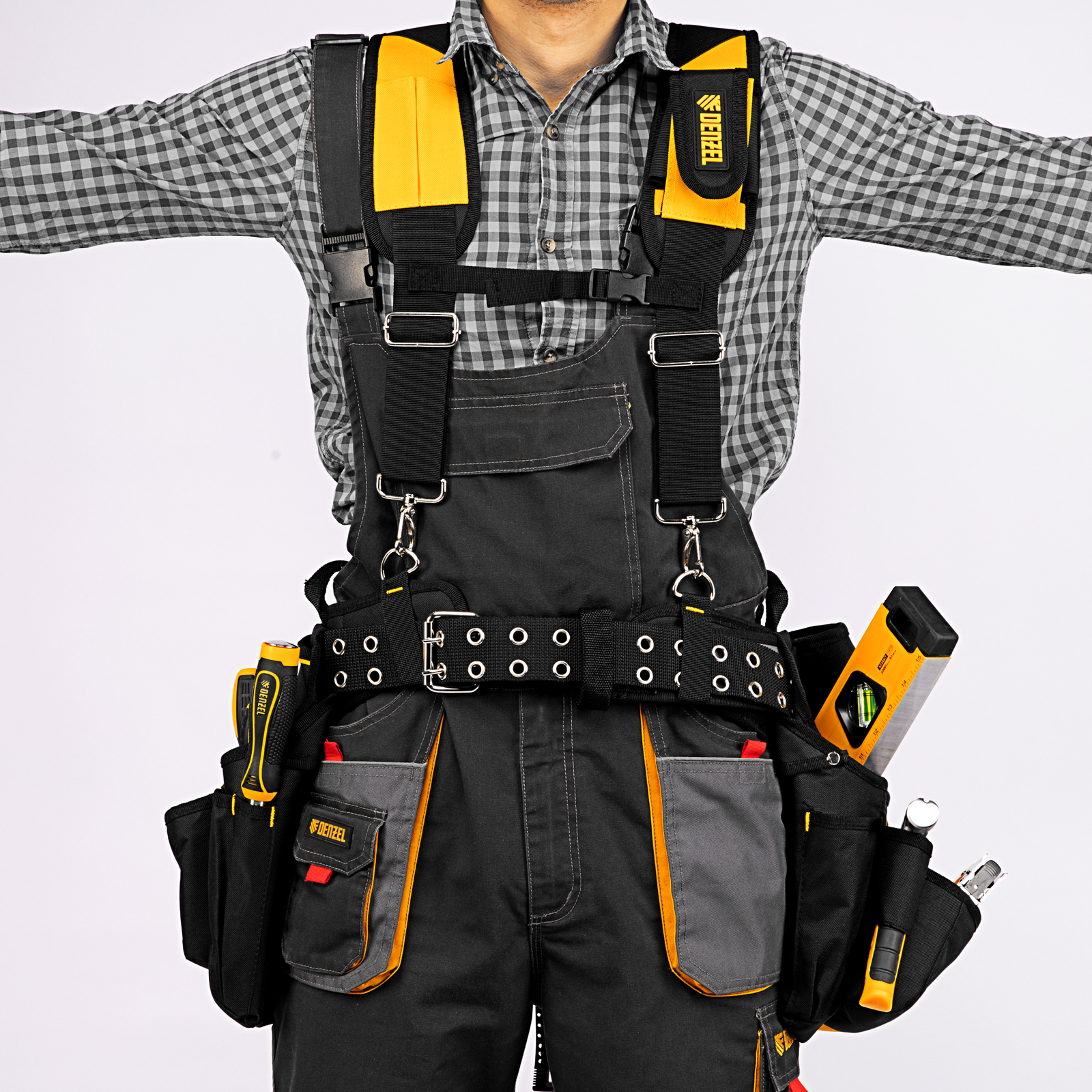 Пояс монтажника усиленный, с лямками, сумки поясные, держатель для молотка Denzel