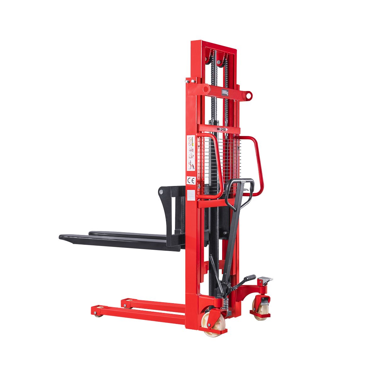 На штабелере установлены раздвижные вилы, позволяющие работать с нестандартными поддонами и негабаритными грузами. Разборный гидроцилиндр облегчает обслуживание штабелера. Колеса установлены из нейлона и имеют стояночный тормоз.
