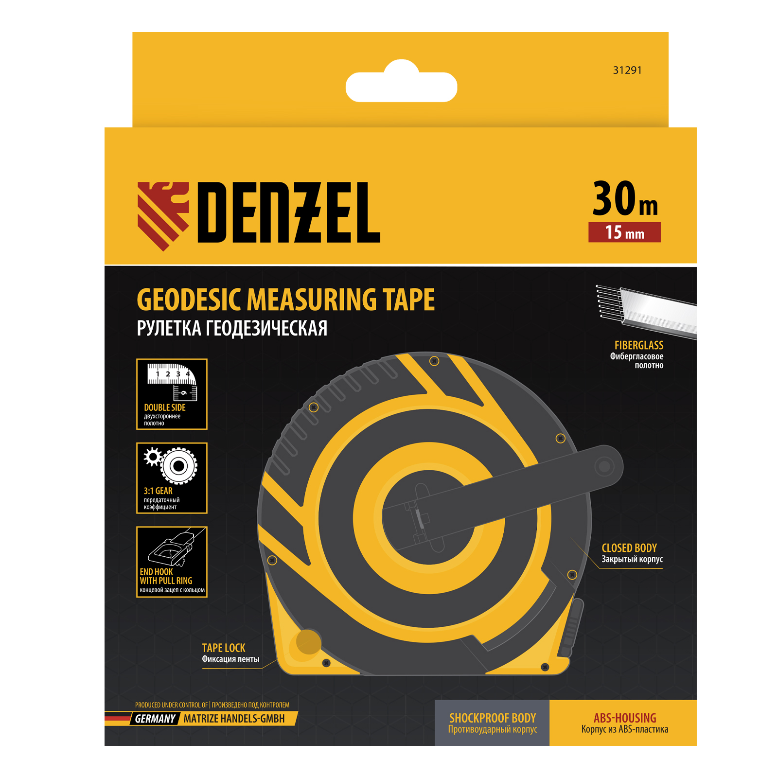 Рулетка геодезическая 30 м х 15 мм, закрытый корпус, фиберглассовая лента Denzel