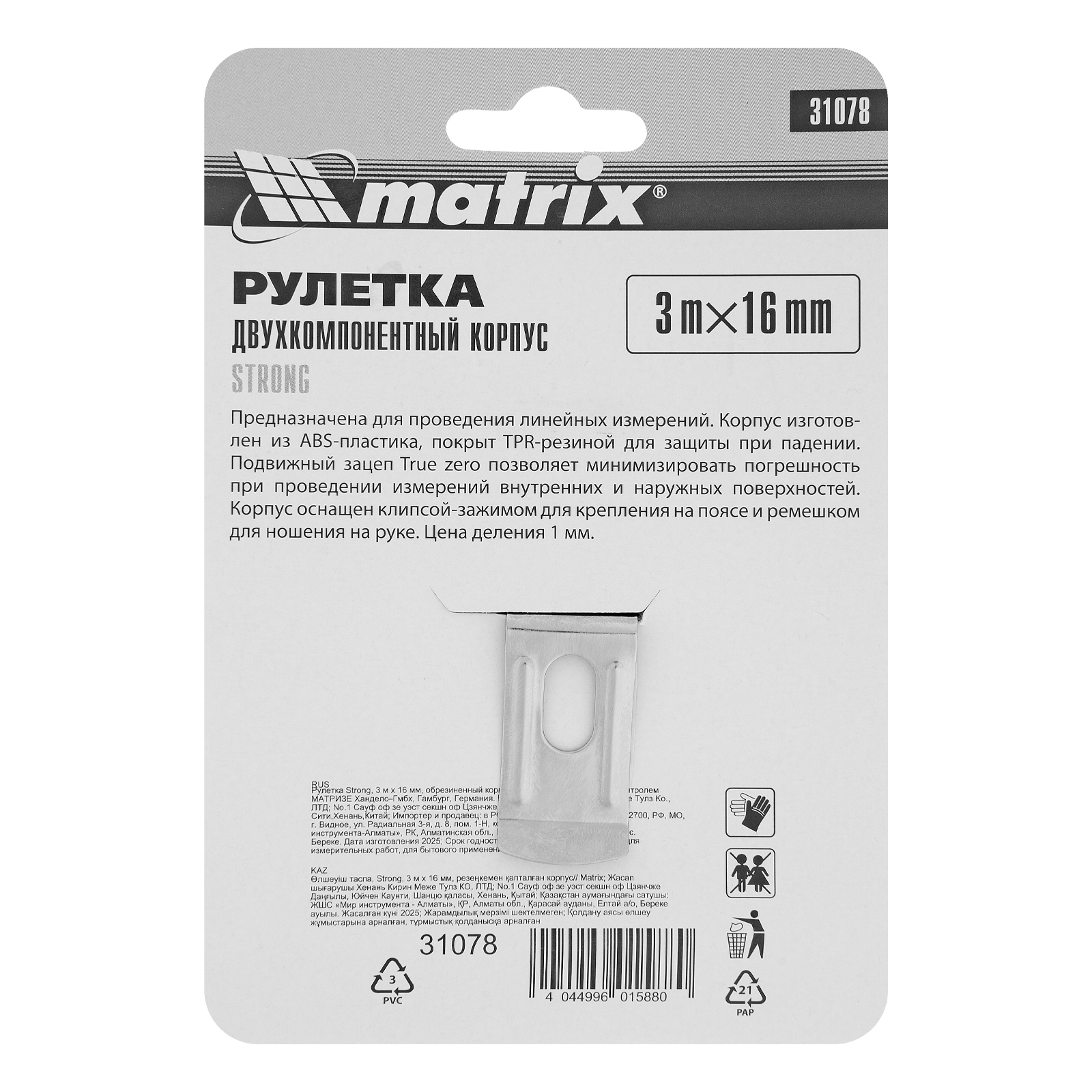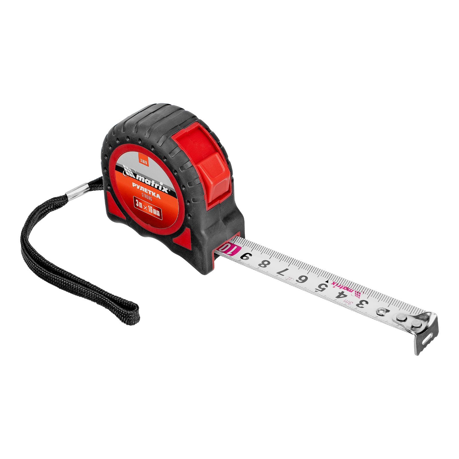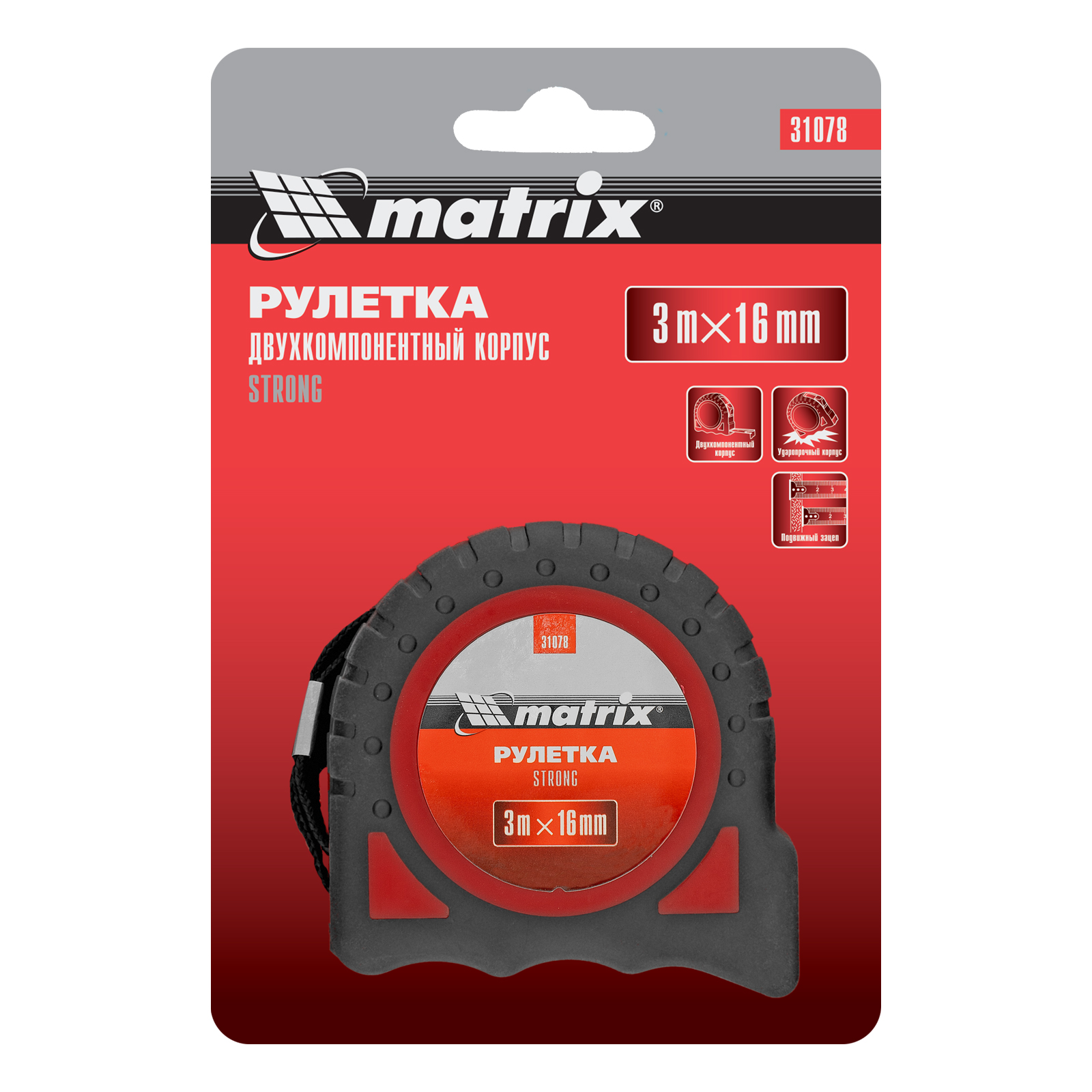 Рулетка Strong,3 м х 16 мм,обрезиненный корпус Matrix