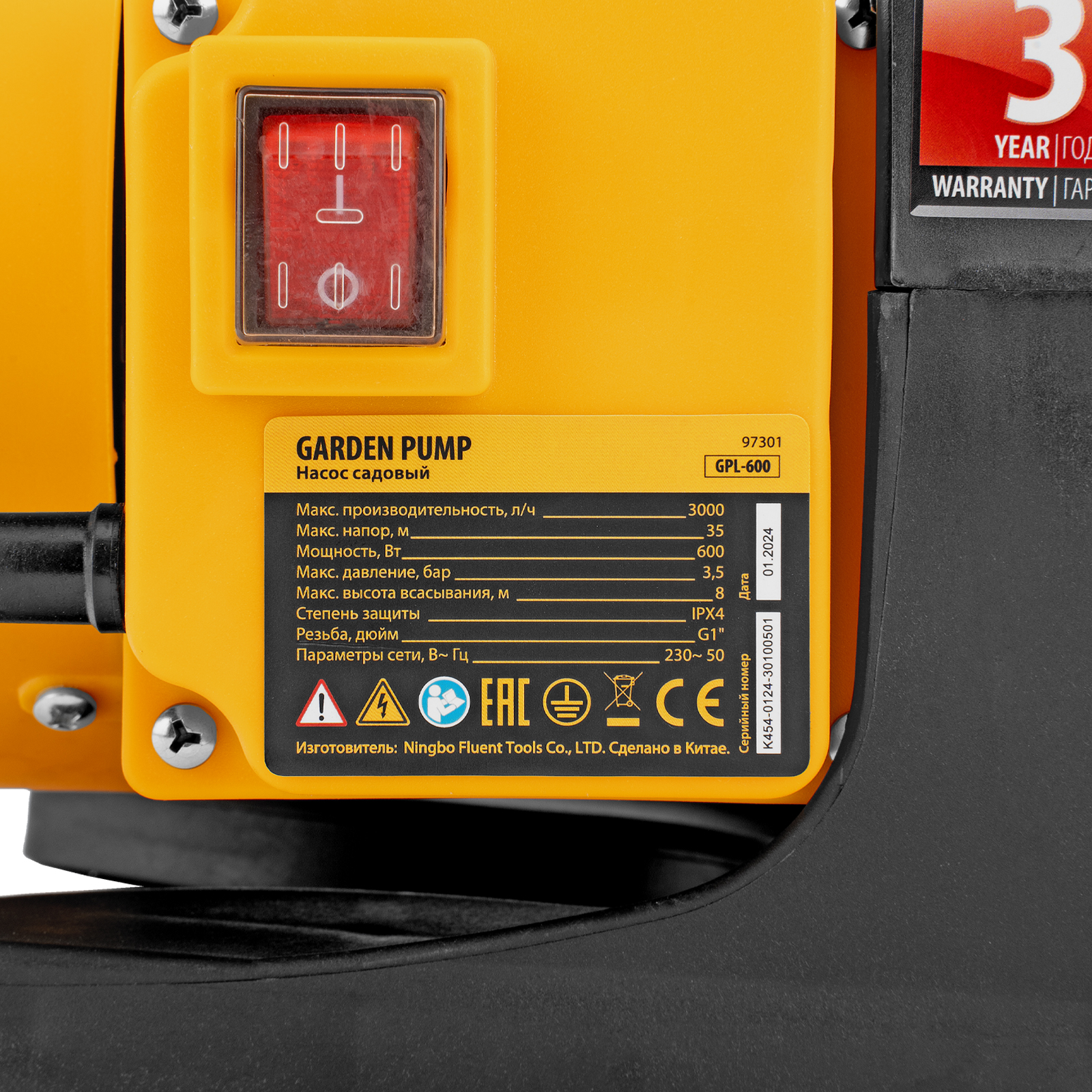 Садовый поверхностный насос GPL600, 600 Вт, 3000 л/ч, подъем 35 м, пластик Denzel