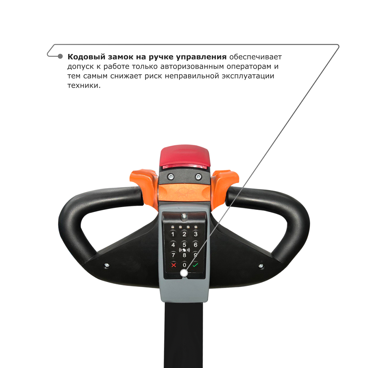С целью повышения безопасности и комфорта работы, на штабелере установлено: кнопка аварийного отключения, позволяющая быстро отключить штабелер в случае возникновения опасной ситуации, защитный экран на мачте из оргстекла, защищающий оператора от возможных травм. Ручка управления имеет интегрированный замок зажигания и полный набор необходимых клавиш управления, в том числе кнопку «черепашьего хода».
