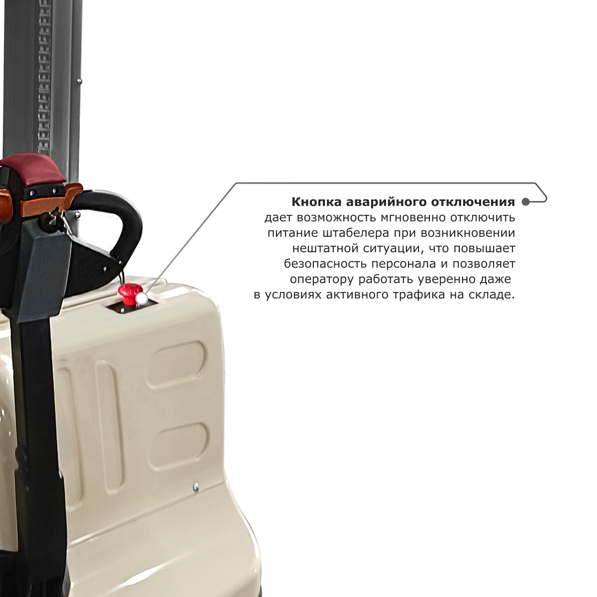 На штабелере установлены кнопка аварийного отключения, позволяющая быстро остановить штабелер в случае возникновения опасной ситуации, и решетчатый экран на мачте, защищающий оператора от возможных травм.