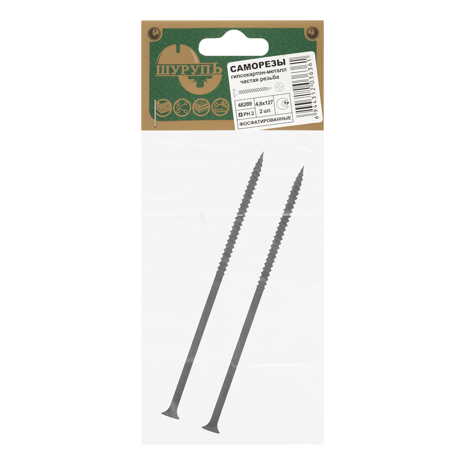 Саморезы по гипсокартону частая резьба, 4.8 х 127, PH №2, фосфатированные 2 шт Шурупь