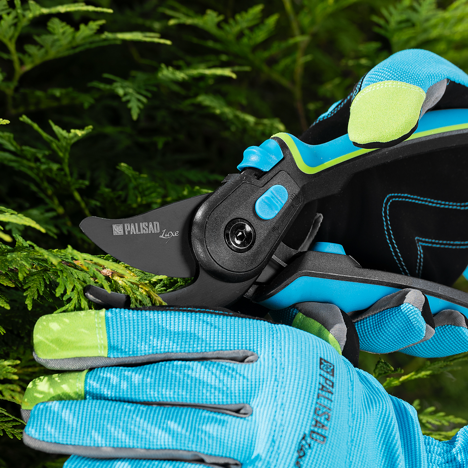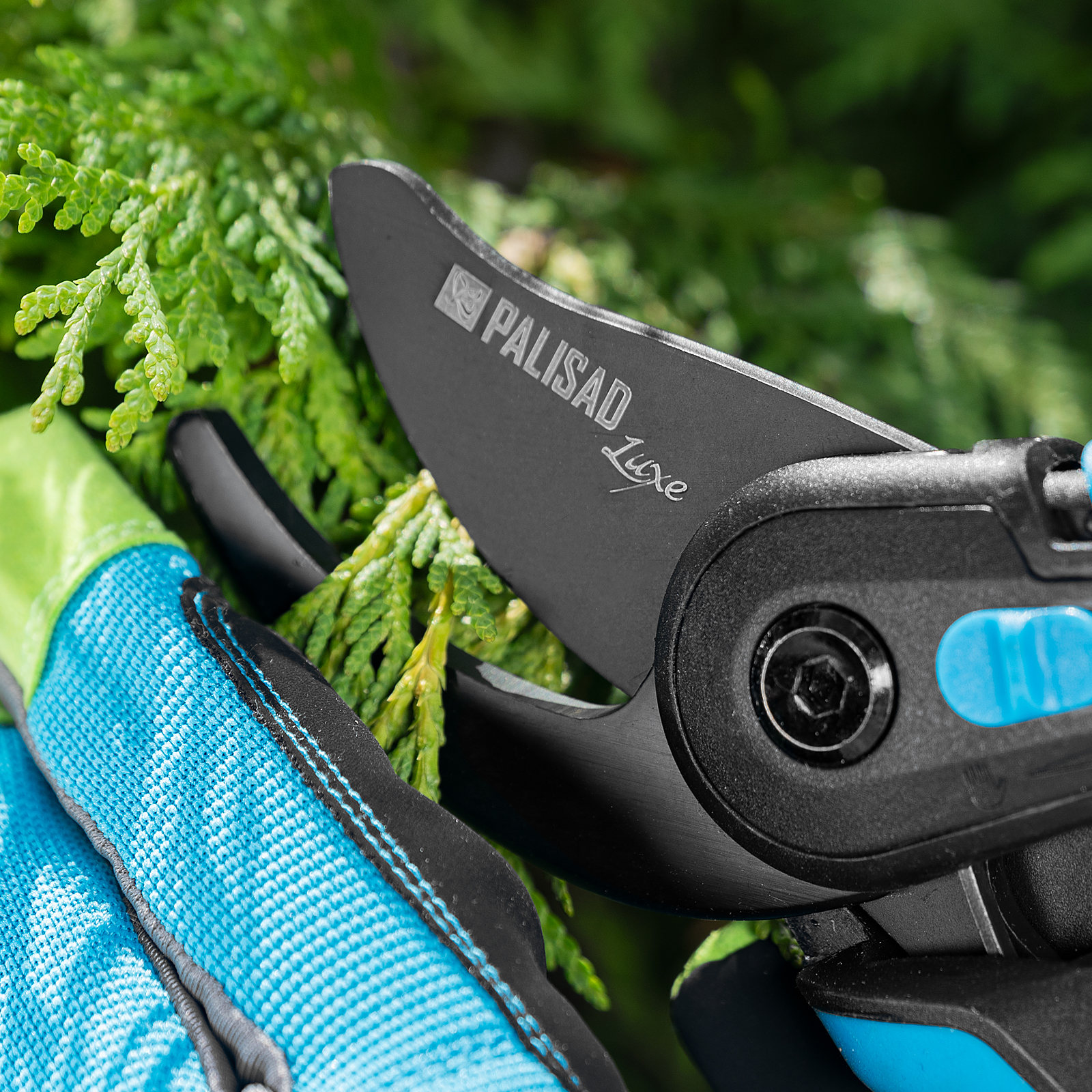 Секатор прямого реза Palisad LUXE длиной 225 мм, с регулировкой захвата и трехкомпонентными рукоятками, используется для срезания живых веток толщиной до 24 мм. Режущее лезвие перемещается в плоскости, параллельной опорному лезвию, поэтому срез получается ровным и чистым, а ущерб для растения сведен к минимуму. Тефлоновое покрытие лезвия уменьшает трение, а шарнир особой конструкции увеличивает силу сжатия на 10%, что позволяет пользователю прикладывать меньше усилий. Плотность примыкания лезвий можно регулировать при помощи винта. Секатор будет полезен для ухода за растениями на загородном участке.