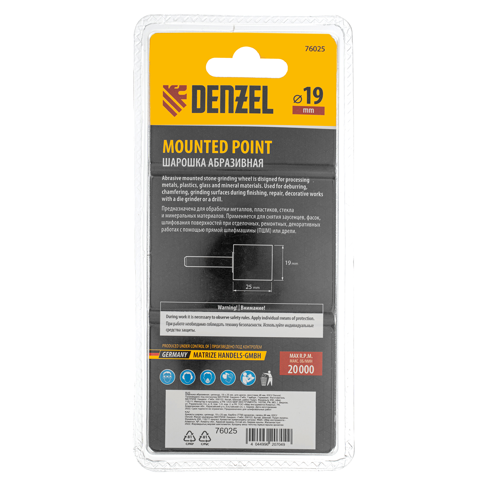 Шарошка абразивная Denzel 76025 с рабочей частью в форме цилиндра 19 х 25 мм, с хвостовиком диаметром 6 мм, устанавливается на дрель, шуруповерт или или прямошлифовальную машину (ПШМ). Удобна для зачистки ровных поверхностей, обработки сварных швов, удаления заусенцев, снятия фасок, а также для расширения отверстий и заточки лезвий режущих инструментов. Будет полезна при выполнении ремонтных, кузовных, отделочных работ.