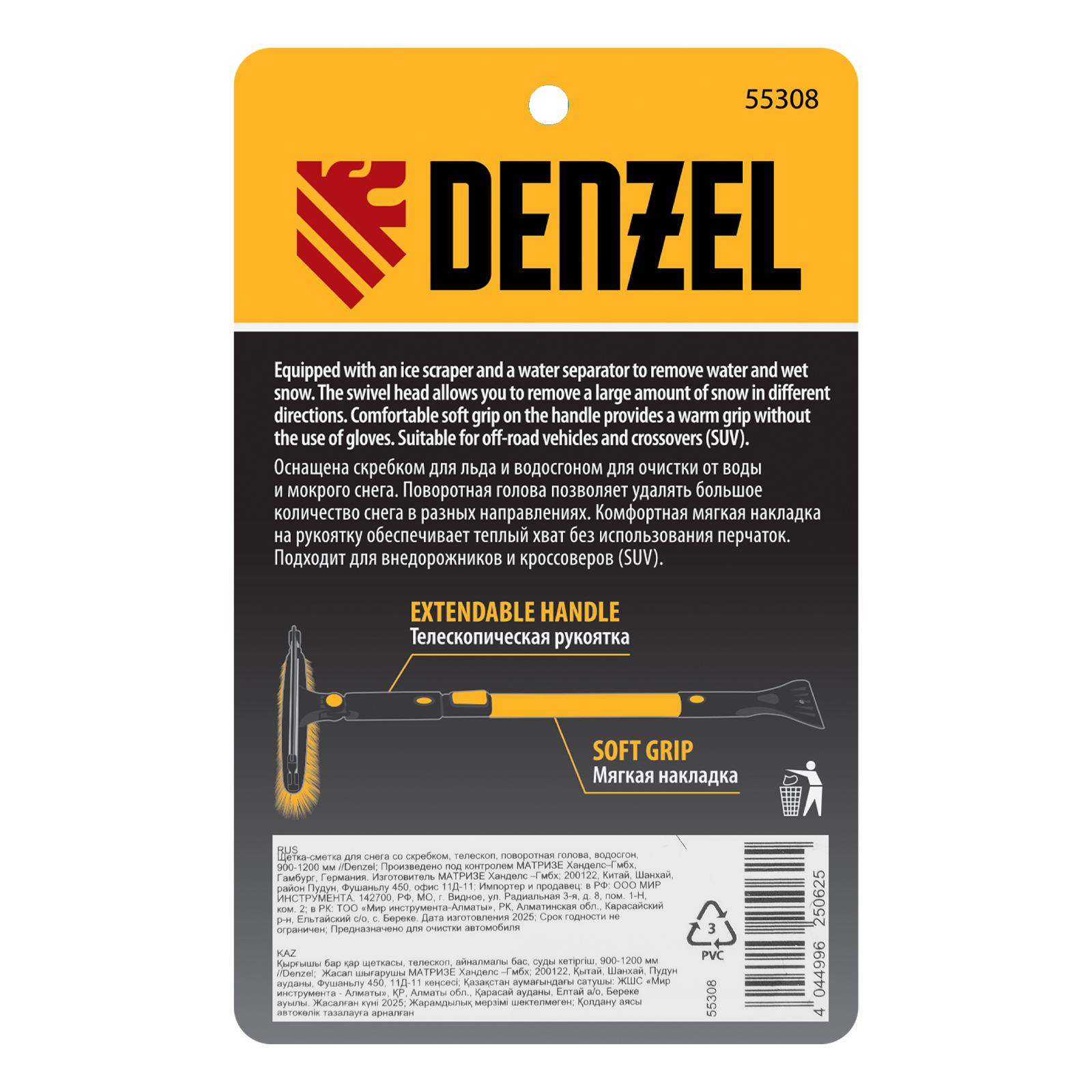 Щетка-сметка Denzel 55308 со скребком, поворотной головой, водосгоном и телескопической рукояткой длиной 90-120 см предназначена для быстрой и эффективной очистки кузова автомобиля от снега и наледи. Ее использование позволяет сохранить лакокрасочное покрытие автомобиля в хорошем состоянии, а также обеспечивает безопасность водителя и других участников дорожного движения. Инструмент подходит для внедорожников и кроссоверов.