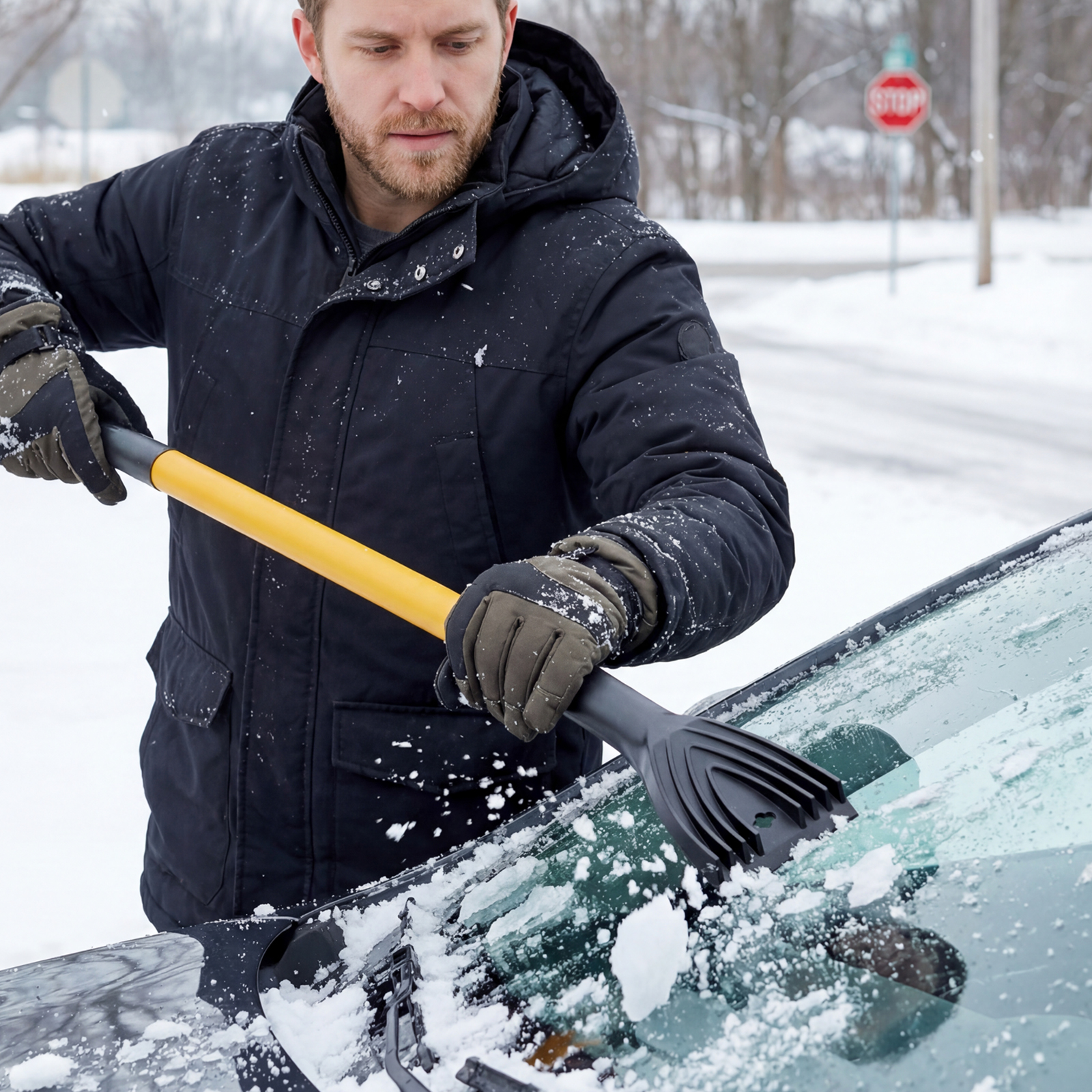 - Эффективность — скребок шириной 12 см имеет специальные зубья, поэтому успешно справляется с толстым слоем наледи.