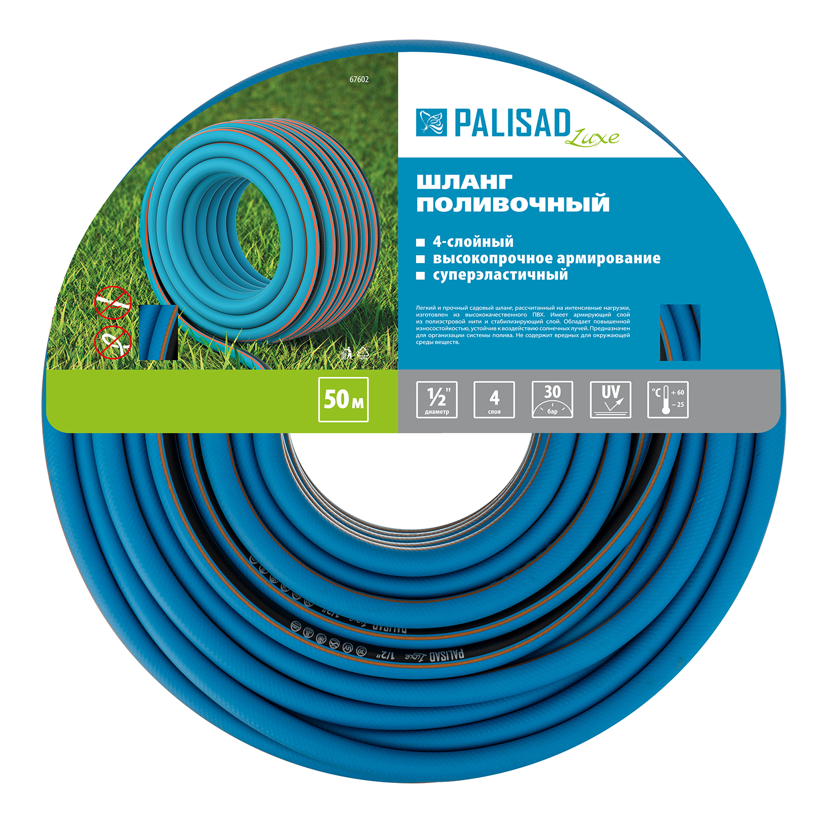 Армированный поливочный шланг Palisad LUXE 67602 длиной 50 м и диаметром 1/2" облегчает уход за растениями, избавляя от необходимости пользоваться лейкой. Совместим с любыми системами полива ТМ Palisad.
