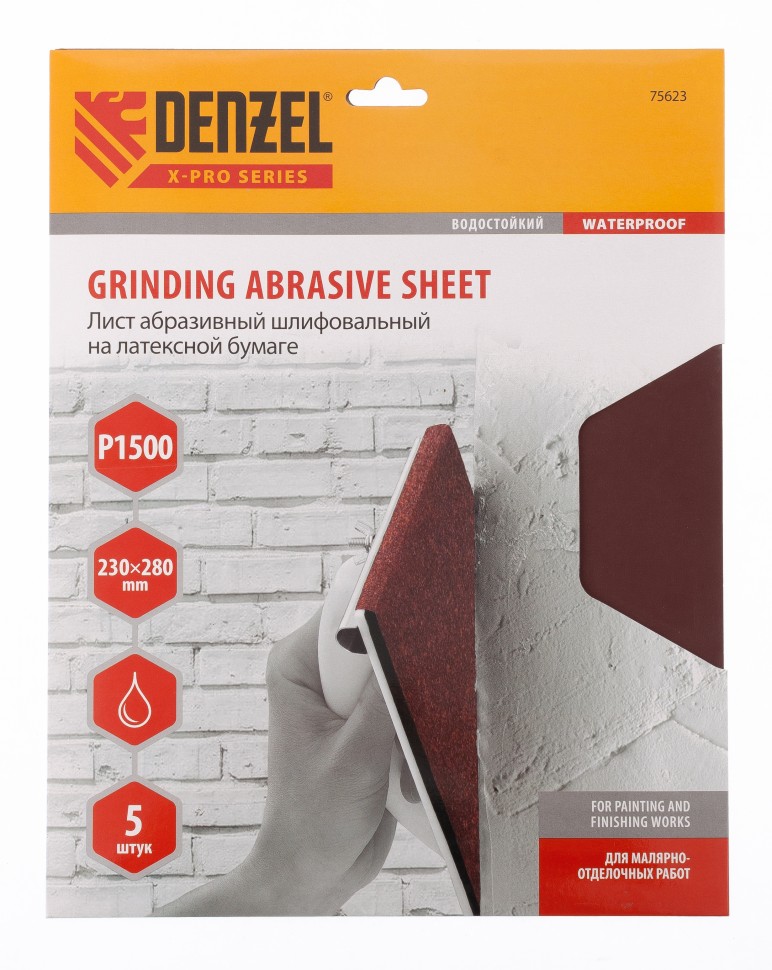 Шлифлист на бумажной основе, P 1500, 230 х 280 мм, 5 шт, латексный, водостойкий Denzel