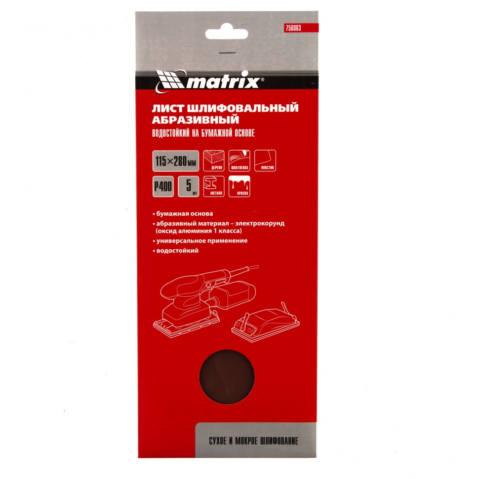 Шлифлист на бумажной основе, P 400, 115 х 280 мм, 5 шт, водостойкий Matrix