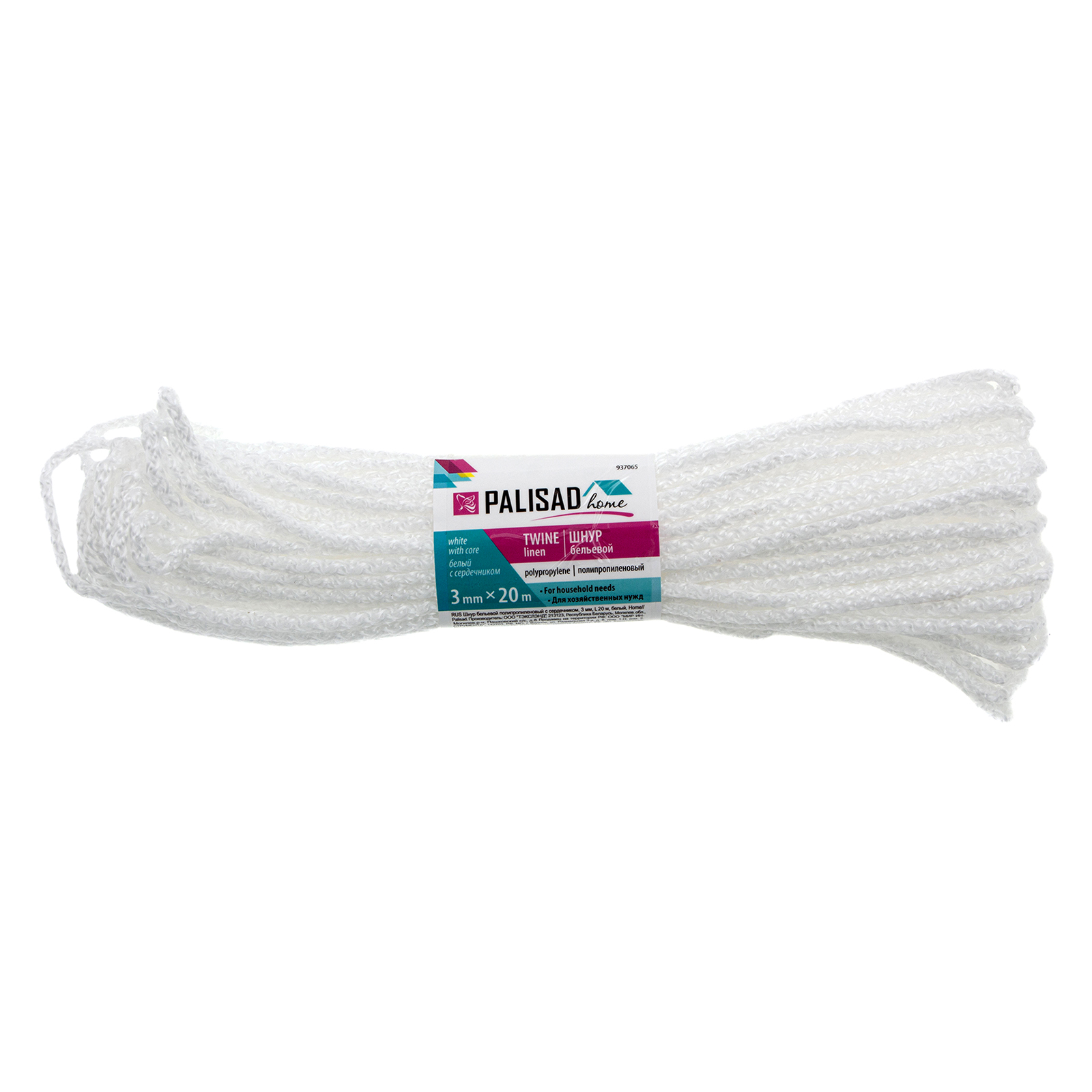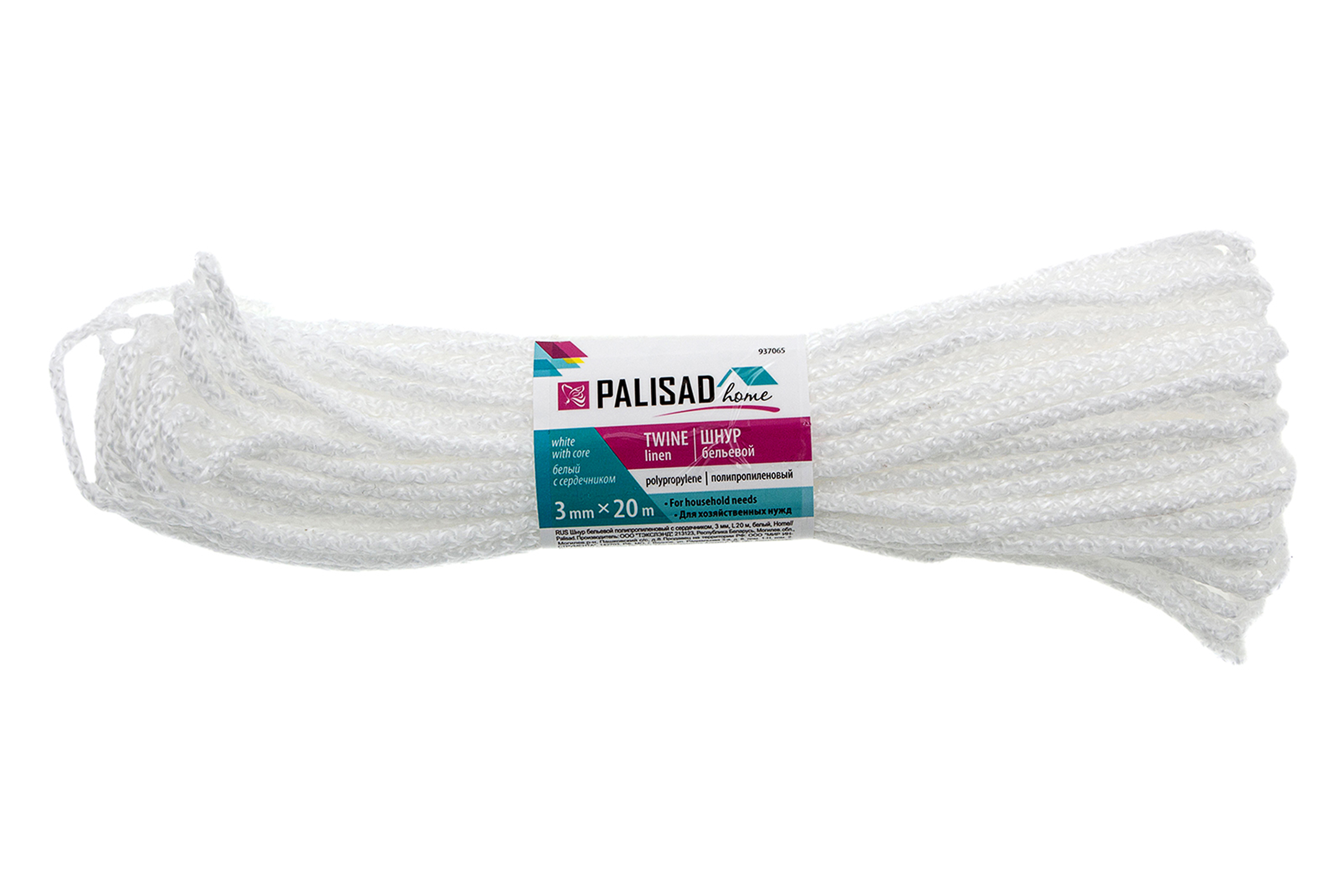 Белый полипропиленовый бельевой шнур Palisad Home 937065 с сердечником, диаметром 3 мм и длиной 20 м, используется для сушки белья, а также в качестве хозяйственной веревки в быту, на рыбалке или в походе. От обычной бельевой веревки для сушки он отличается сердечником из полипропилена, увеличивающим стойкость к нагрузкам. Шнур с полипропиленовой оплеткой выдерживает разрывную нагрузку до 30 кгс, устойчив к растяжению и не провисает под весом мокрых вещей.