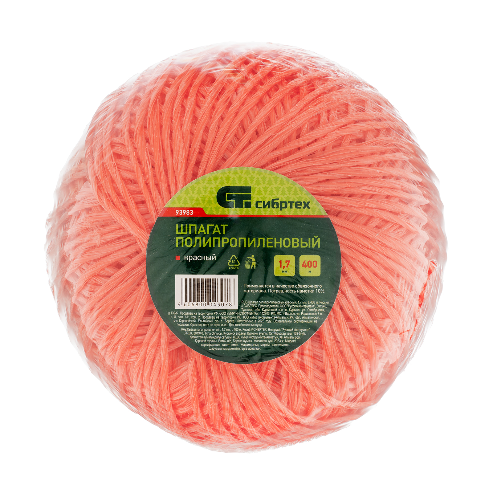 Шпагат полипропиленовый красный, 1.7 мм, L 400 м, Сибртех в Москве