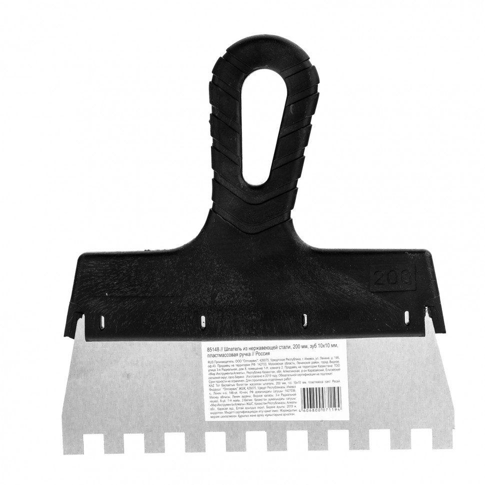 Шпатель из нержавеющей стали, 200 мм, зуб 10 х 10 мм, пластмассовая ручка Sparta |