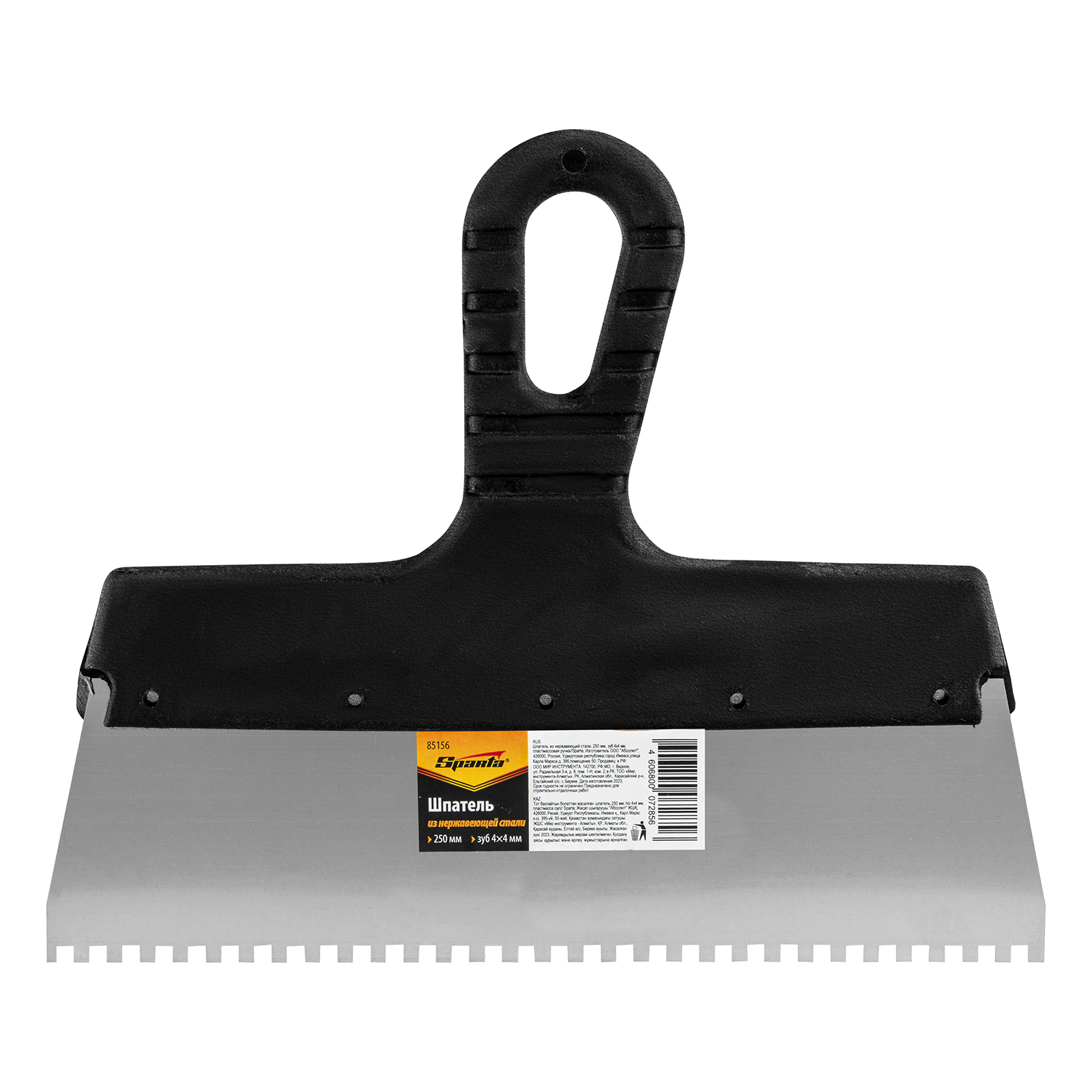 Шпатель из нержавеющей стали, 250 мм, зуб 4 х 4 мм, пластмассовая ручка Sparta