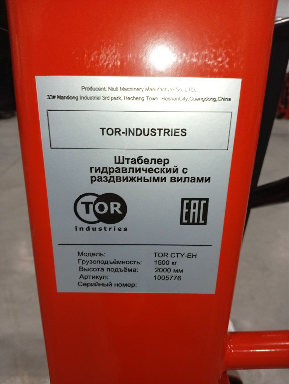 Штабелер гидравлический 1,5 т 2,0 м TOR CTY-EH с раздвижными вилами
