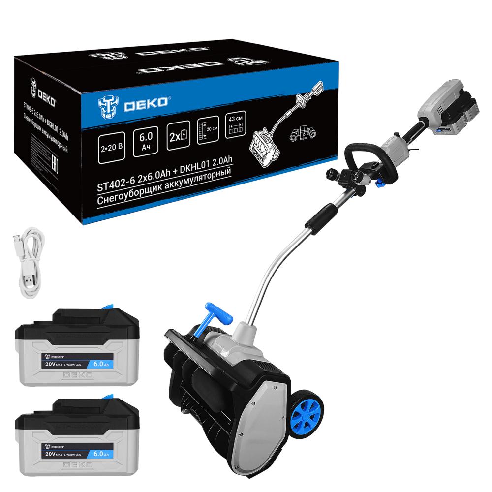 Снегоуборщик аккумуляторный DEKO ST402-6, 2*20В, 2*6.0Ач со съёмной фарой DEKO DKHL01 2.0Ач