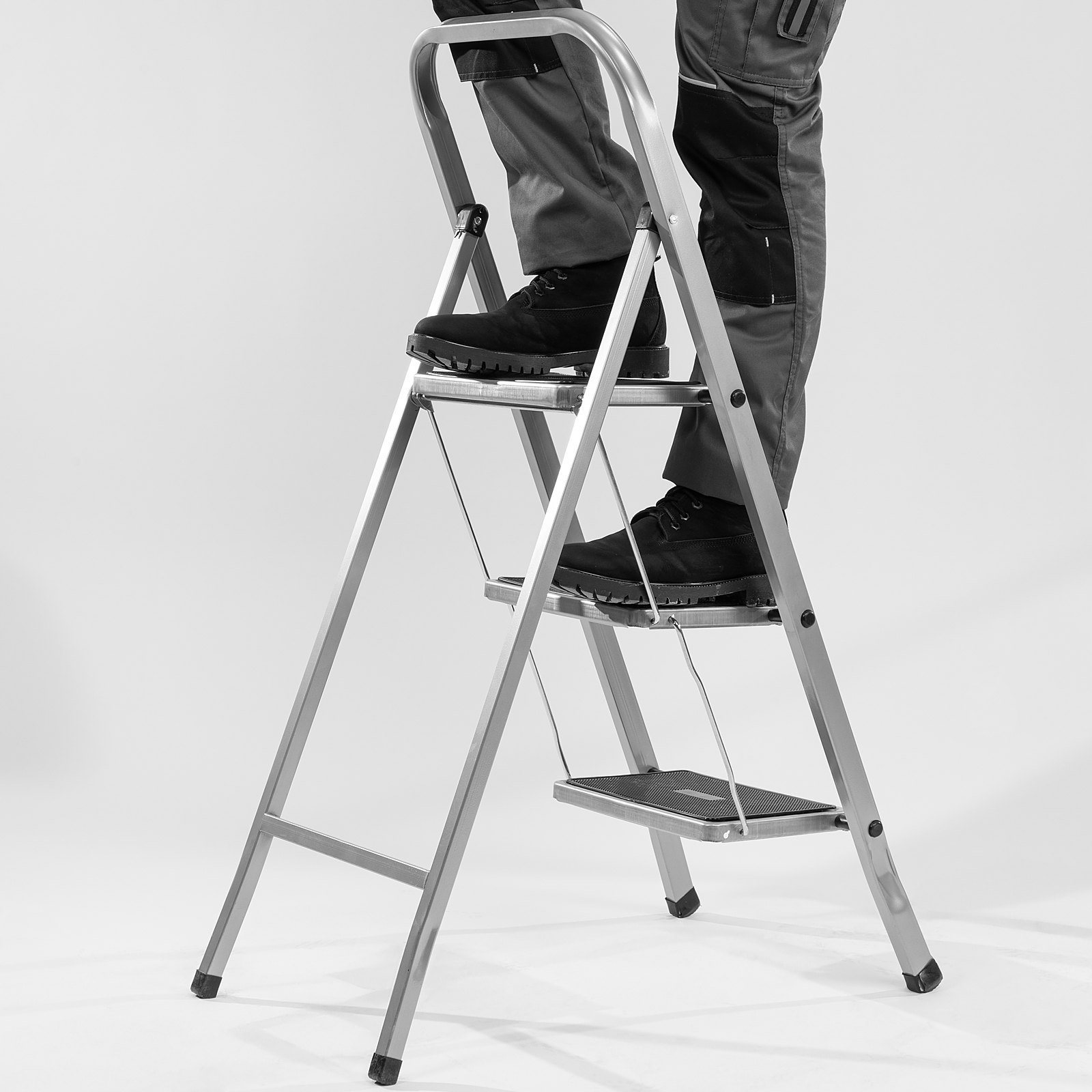 - Прочность — рама и ступени изготовлены из стали, поэтому стремянка выдерживает нагрузку 120 кг.
