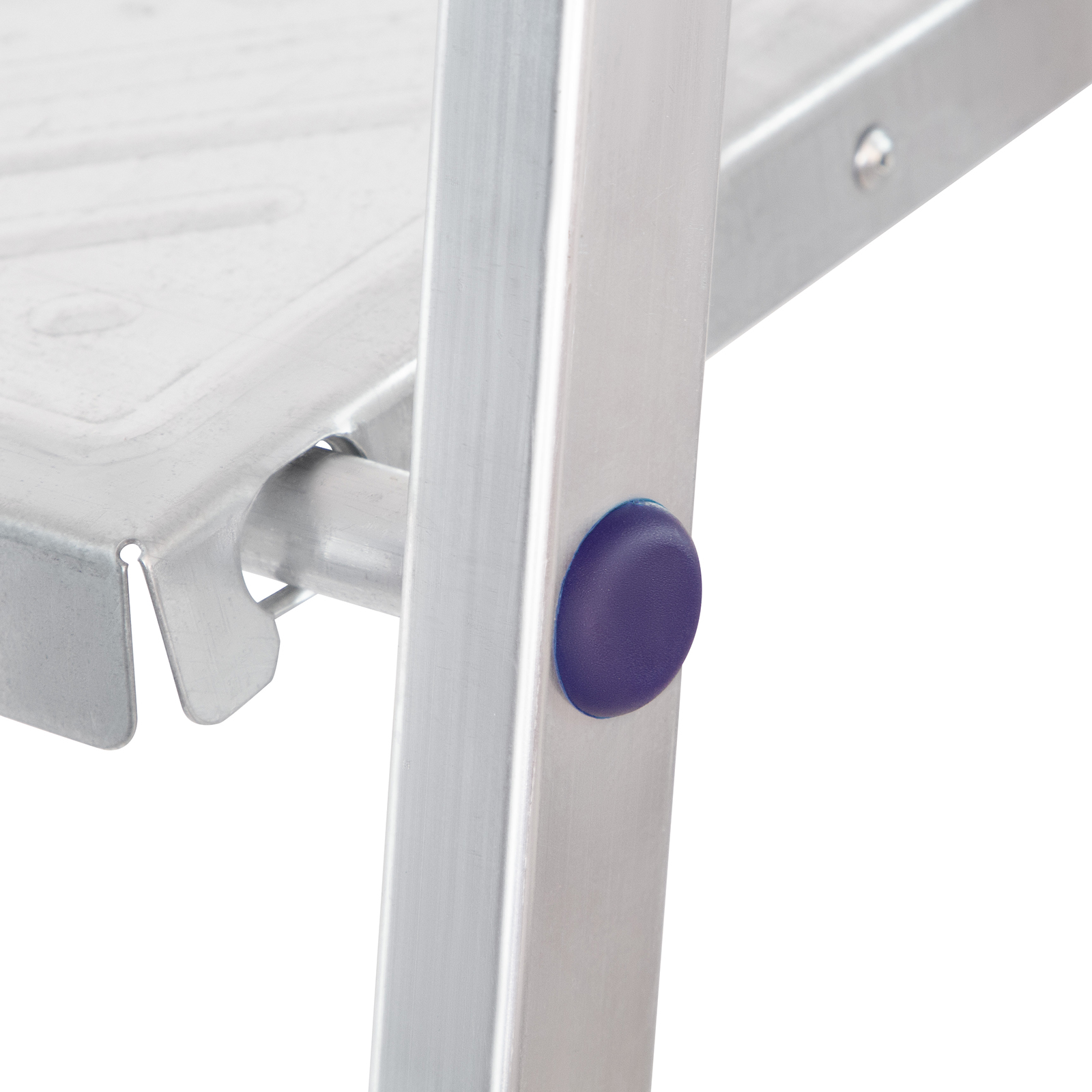 - Продуманная конструкция — стальная рабочая площадка с зацепами надежно фиксирует стремянку в разложенном положении.