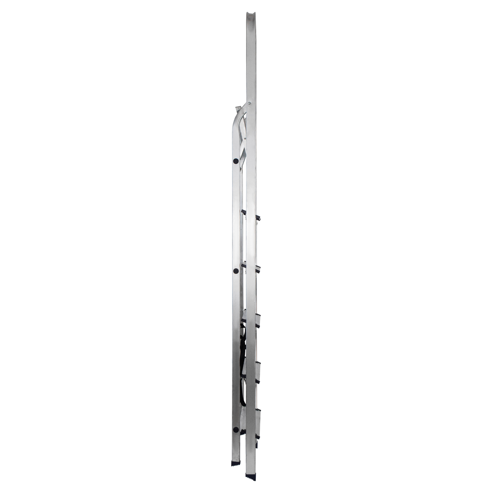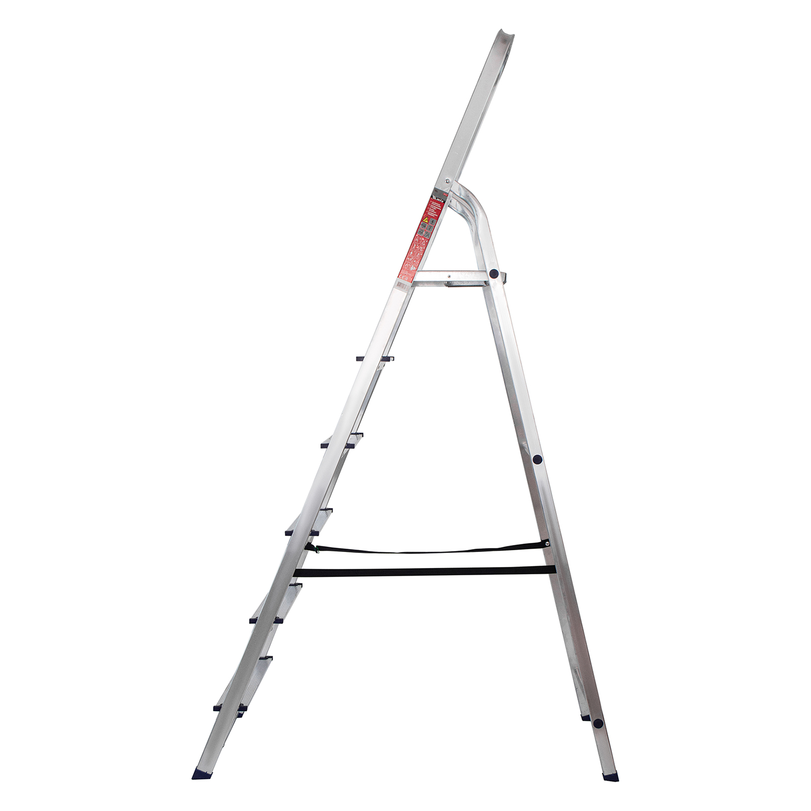 - Надежность — рама из прямоугольного алюминиевого профиля выдерживает нагрузку до 150 кг, широкие ступени закреплены заклепками, страховочные стяжки повышают прочность конструкции.