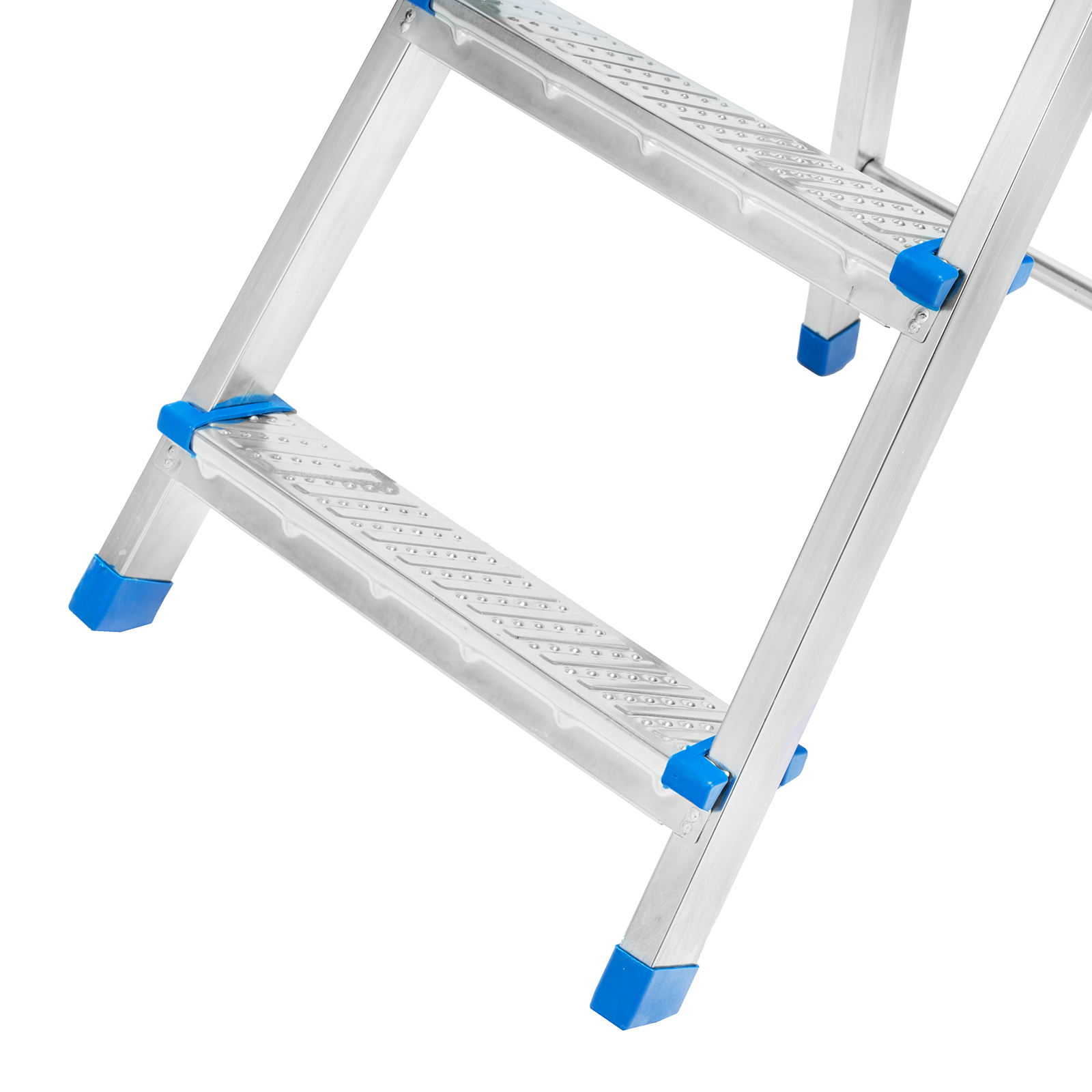 - Простая установка — на верхней площадке предусмотрены специальные зацепы для фиксации стремянки в разложенном состоянии.