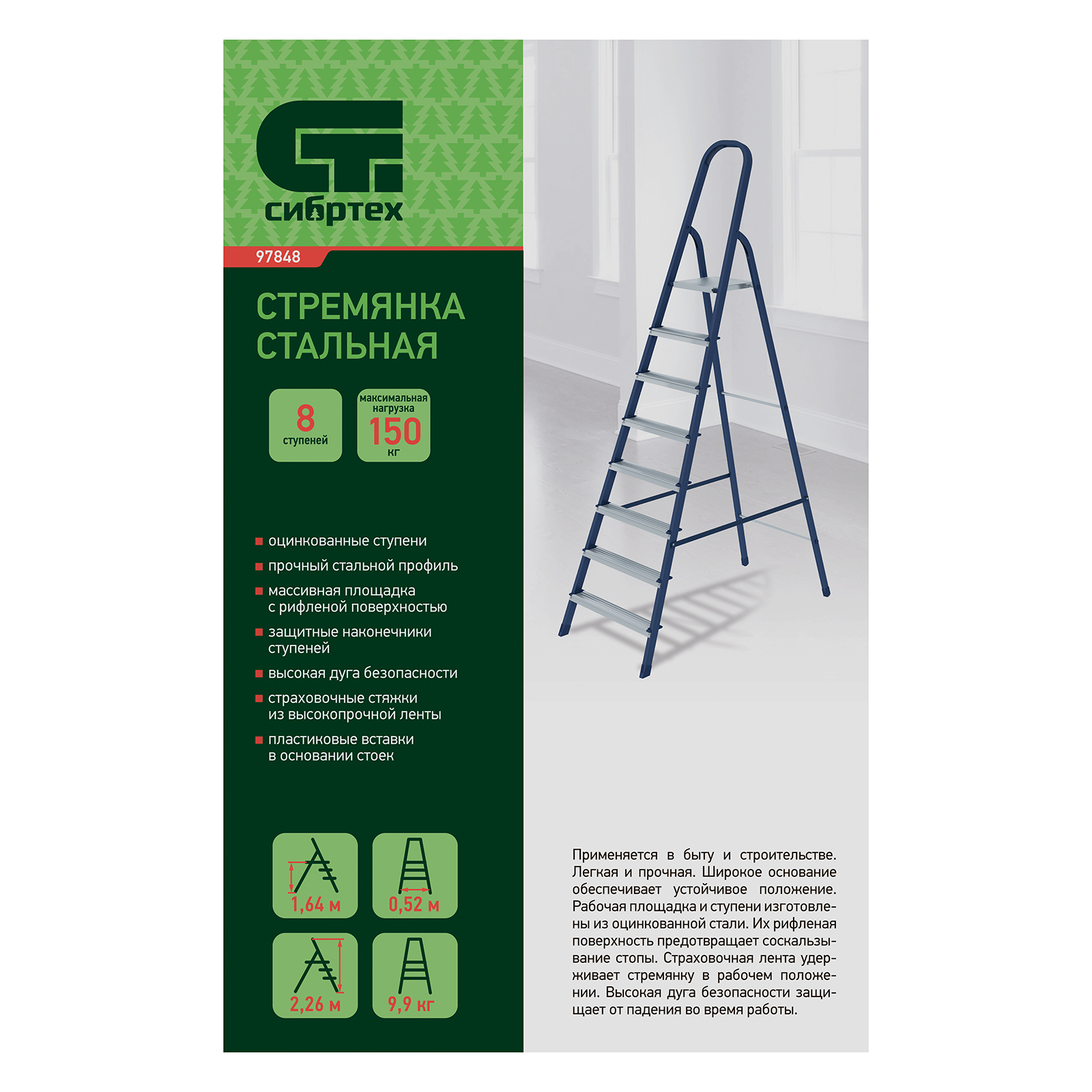Стремянка стальная Сибртех 97848 с 8 ступенями облегчает выполнение ремонтных, отделочных, а также различных бытовых работ на высоте, превышающей человеческий рост. Площадка находится на высоте 164 см от опорной поверхности, рабочая высота стремянки составляет 364 см (при среднем росте пользователя 170 см). Высокая дуга безопасности обеспечивает удобную эксплуатацию. Стремянка пригодится дома и на даче.
