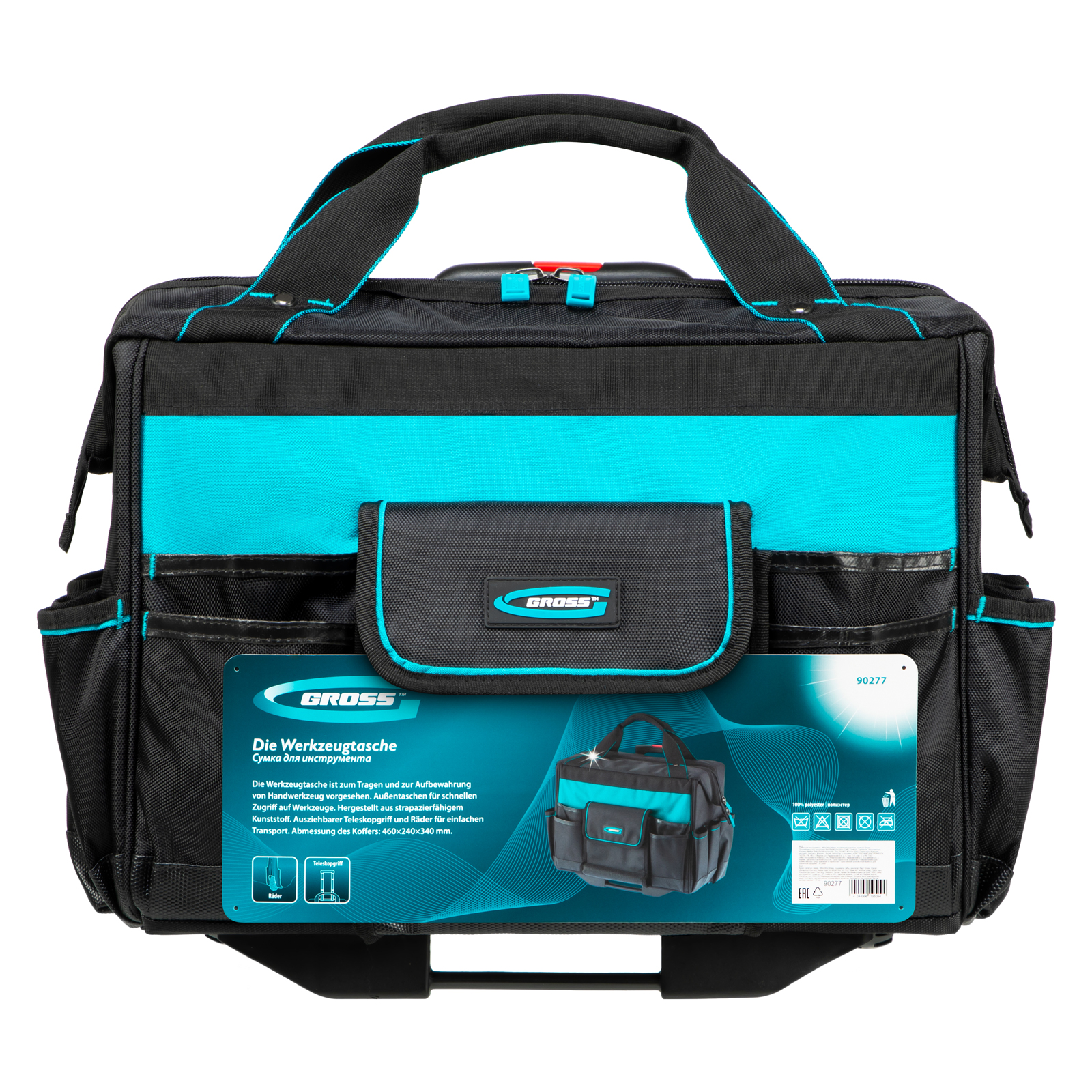Сумка Gross 90277 размером 460 х 240 х 340 мм, с выдвижной рукояткой и колесами, имеет 18 карманов и вместительное основное отделение, в которые можно сложить необходимый ручной и электроинструмент. Сумка пригодится дома, в гараже и в поездке.