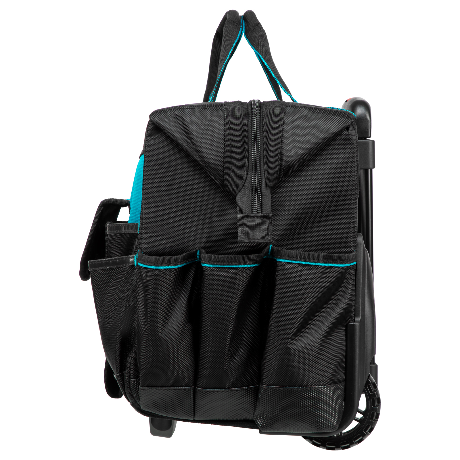 - Мобильность — сумку с инструментами легко перемещать при помощи колес и телескопической рукоятки.