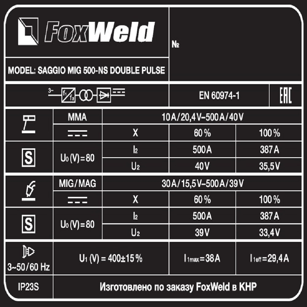 Сварочный полуавтомат SAGGIO MIG 500-NS DOUBLE PULSE (пр-во FoxWeld/КНР)