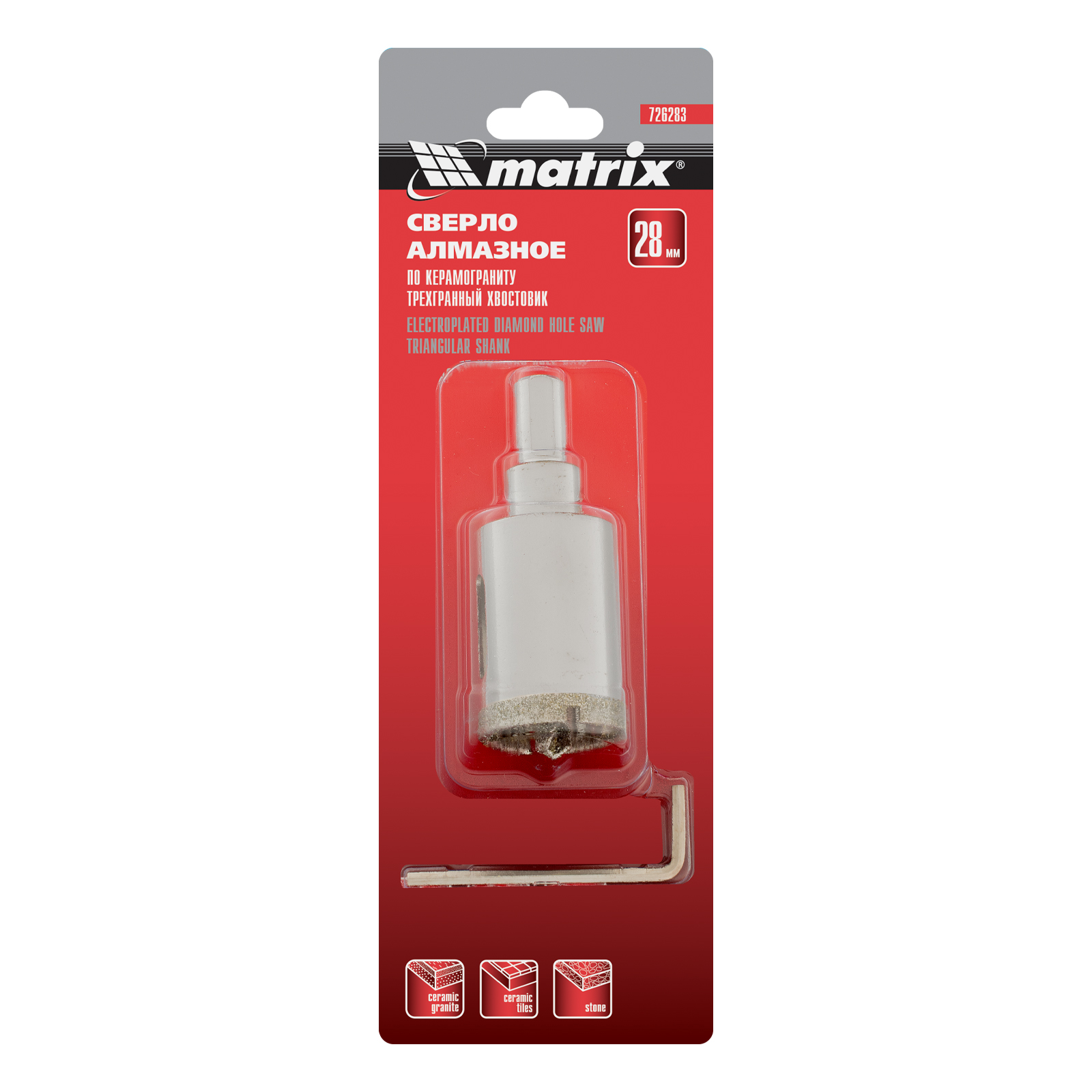 Сверло алмазное по керамограниту, 28 х 67 мм, трехгранный хвостовик Matrix
